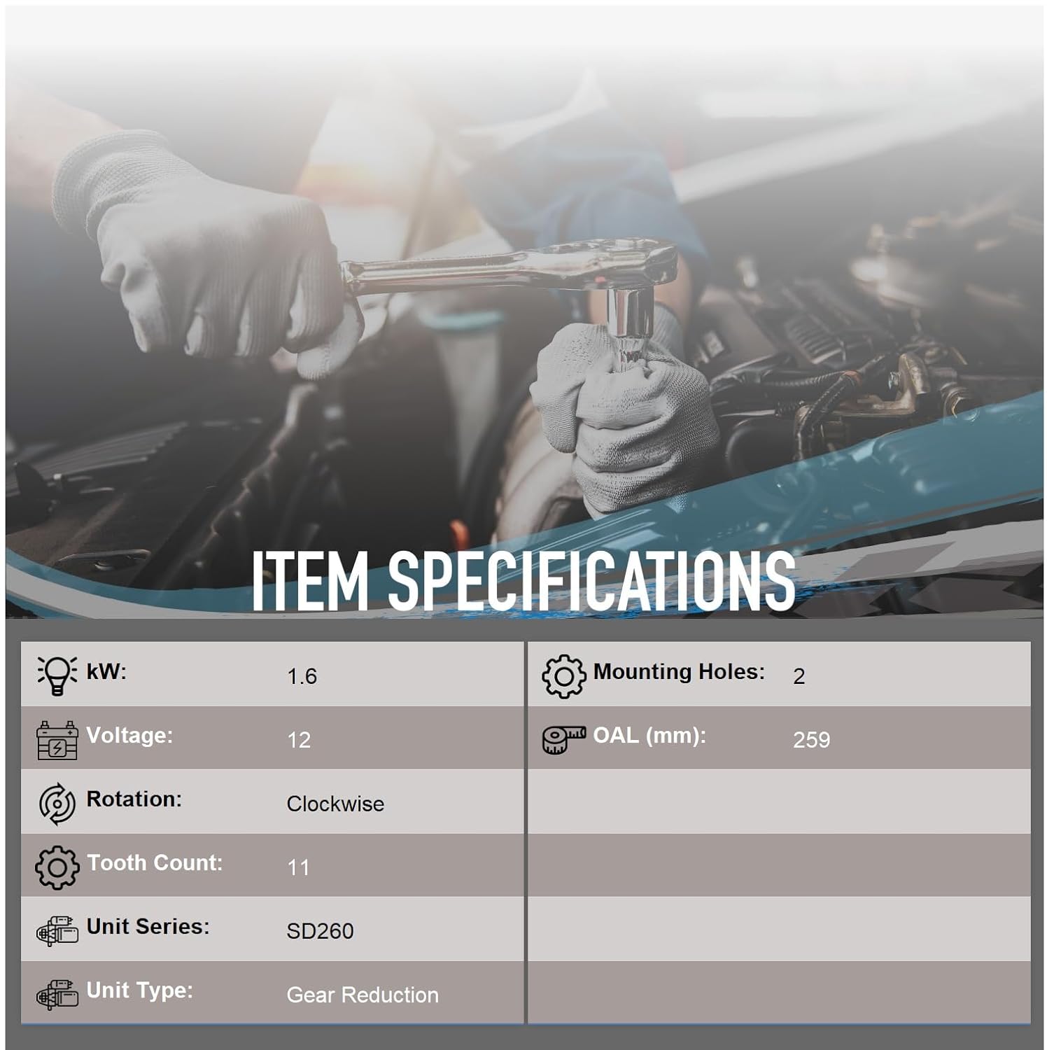 Com um design robusto e tecnologia avançada, o motor de arranque possui uma tensão de 12V e uma potência de 1.6 kW, proporcionando a força necessária para iniciar o motor com facilidade. A rotação no sentido horário (CW) e a contagem de dentes de 11 garantem uma compatibilidade perfeita com os sistemas elétricos dos veículos mencionados. Com um comprimento total de 259mm, este motor de arranque é compacto e fácil de instalar, embora não inclua hardware de montagem.