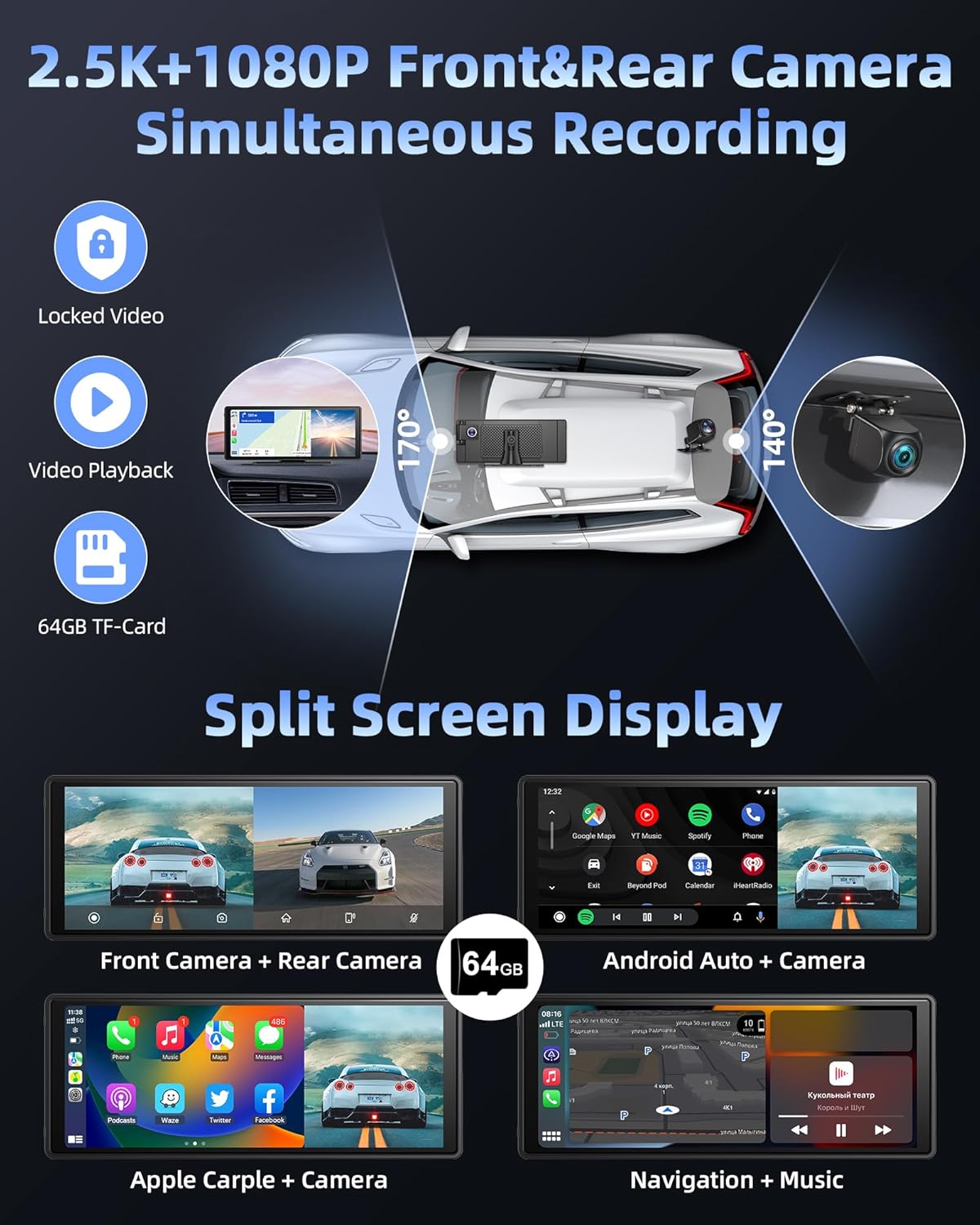 Tela Wireless CarPlay 10.26” com Câmera 2.5K e Android Auto – Estéreo Automotivo Portátil com GPS, Bluetooth, AirPlay, AUX/FM e Siri