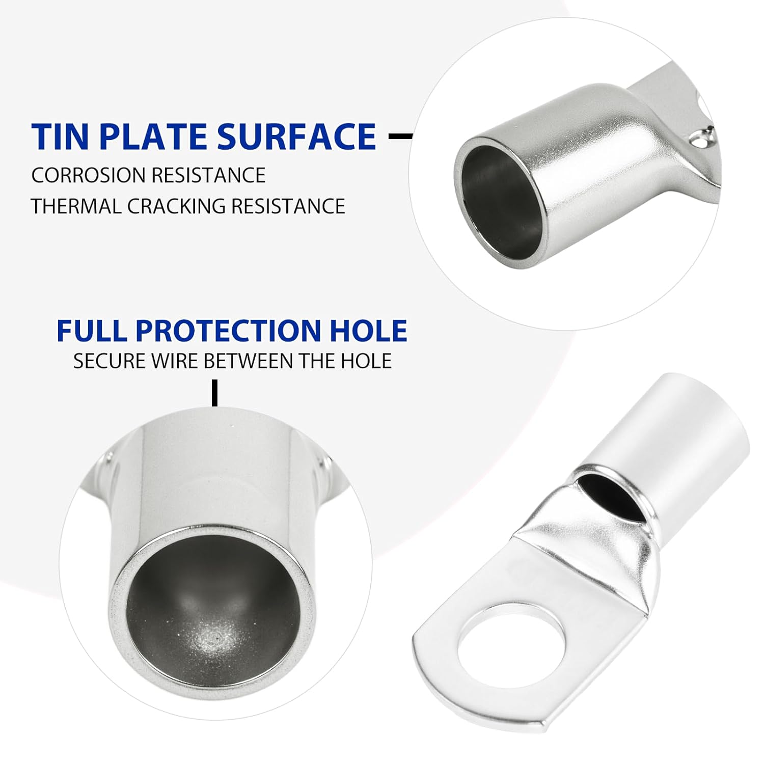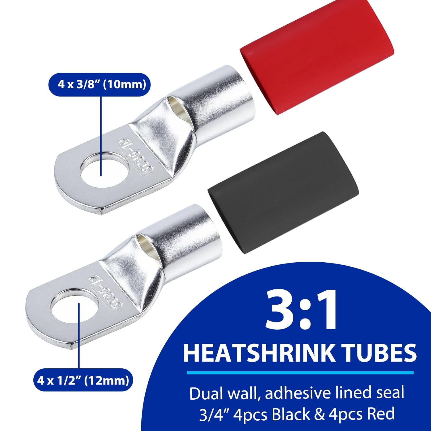 My biggest disappointment with these cables is that the heat-shrink tubing is too large and will not completely shrink to firmly grip the lugs. I used a heat gun set to 400 degrees Fahrenheit and no matter how long I held the wire over the gun, the tubbing would never close over the lugs. I even tried an open flame but all that did was to add soot to the tubbing. 😊