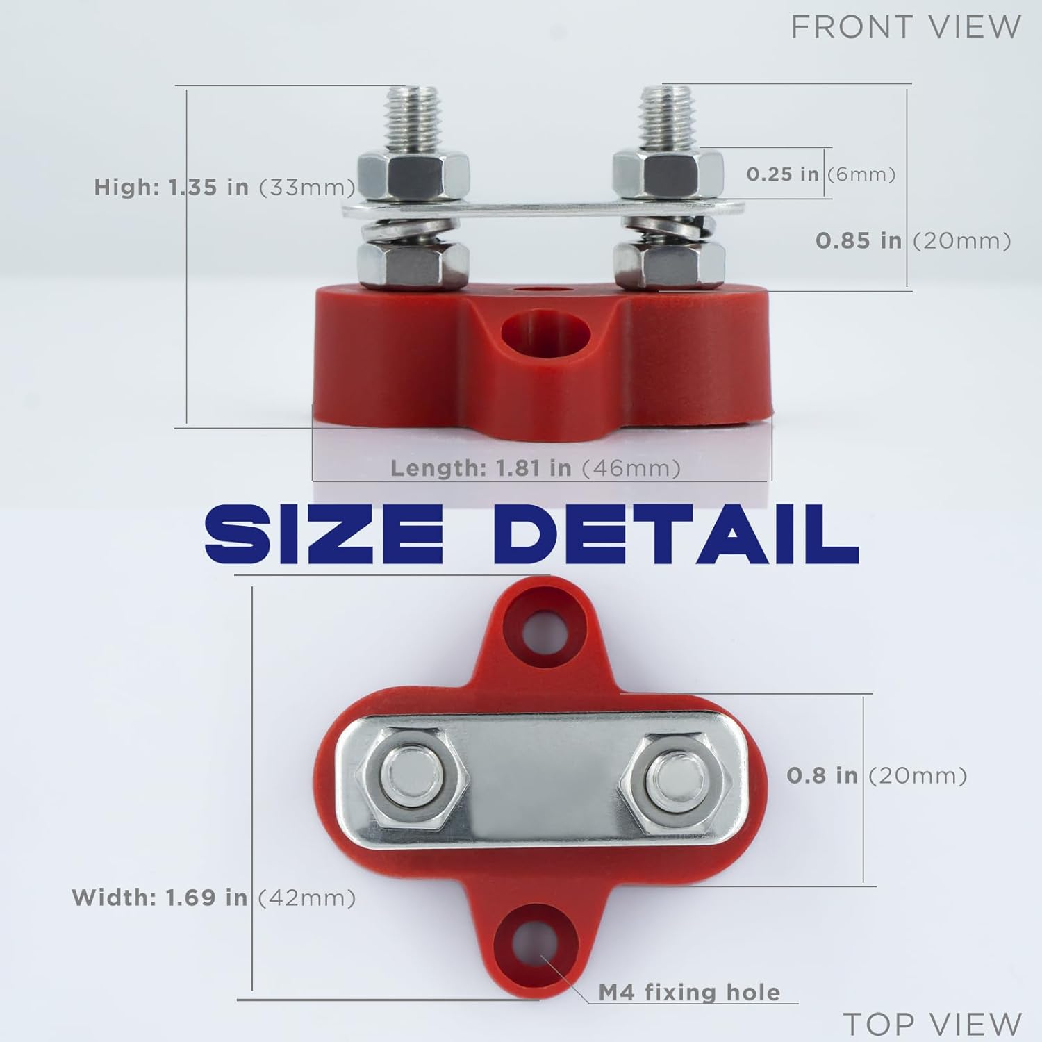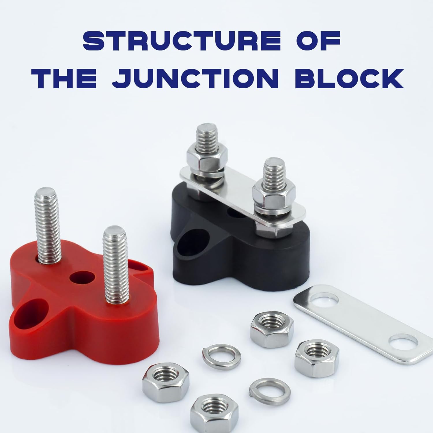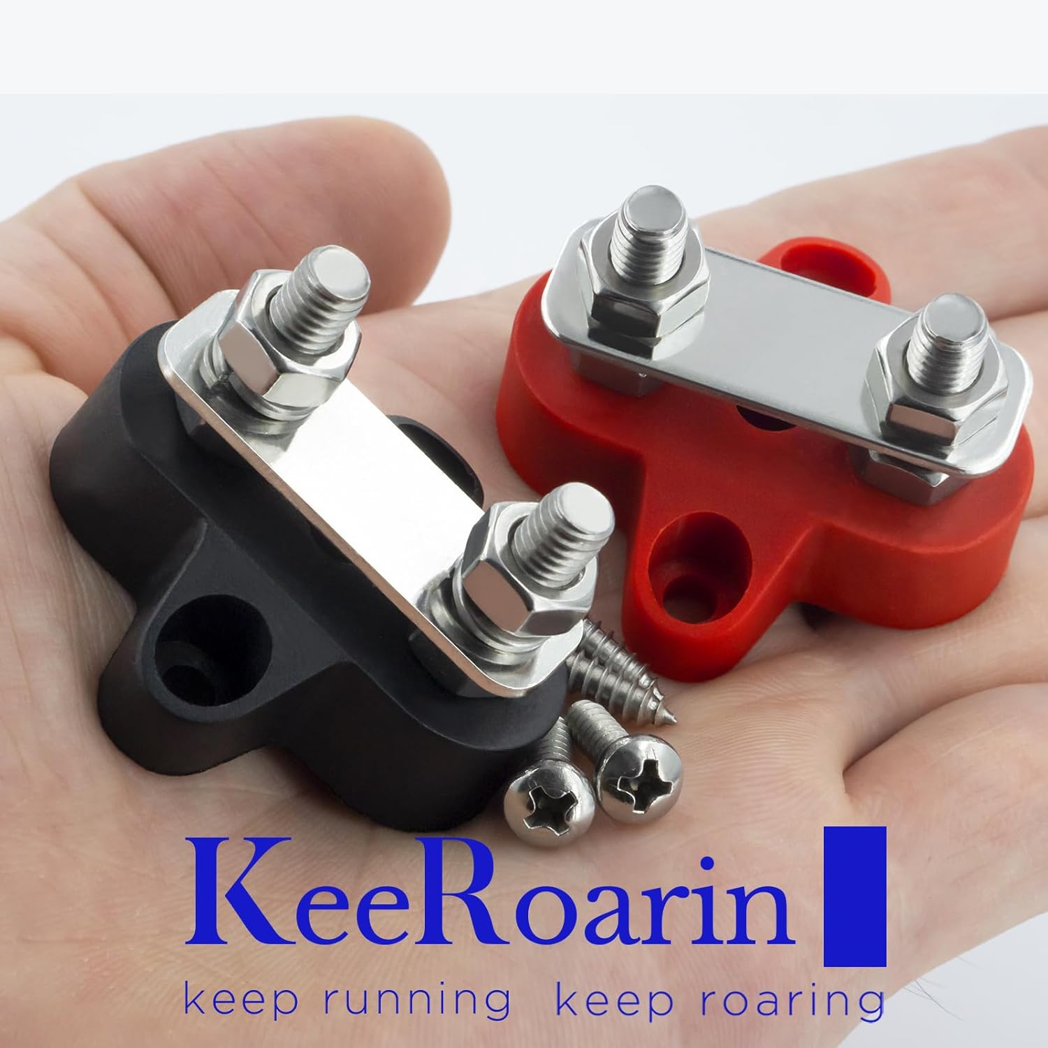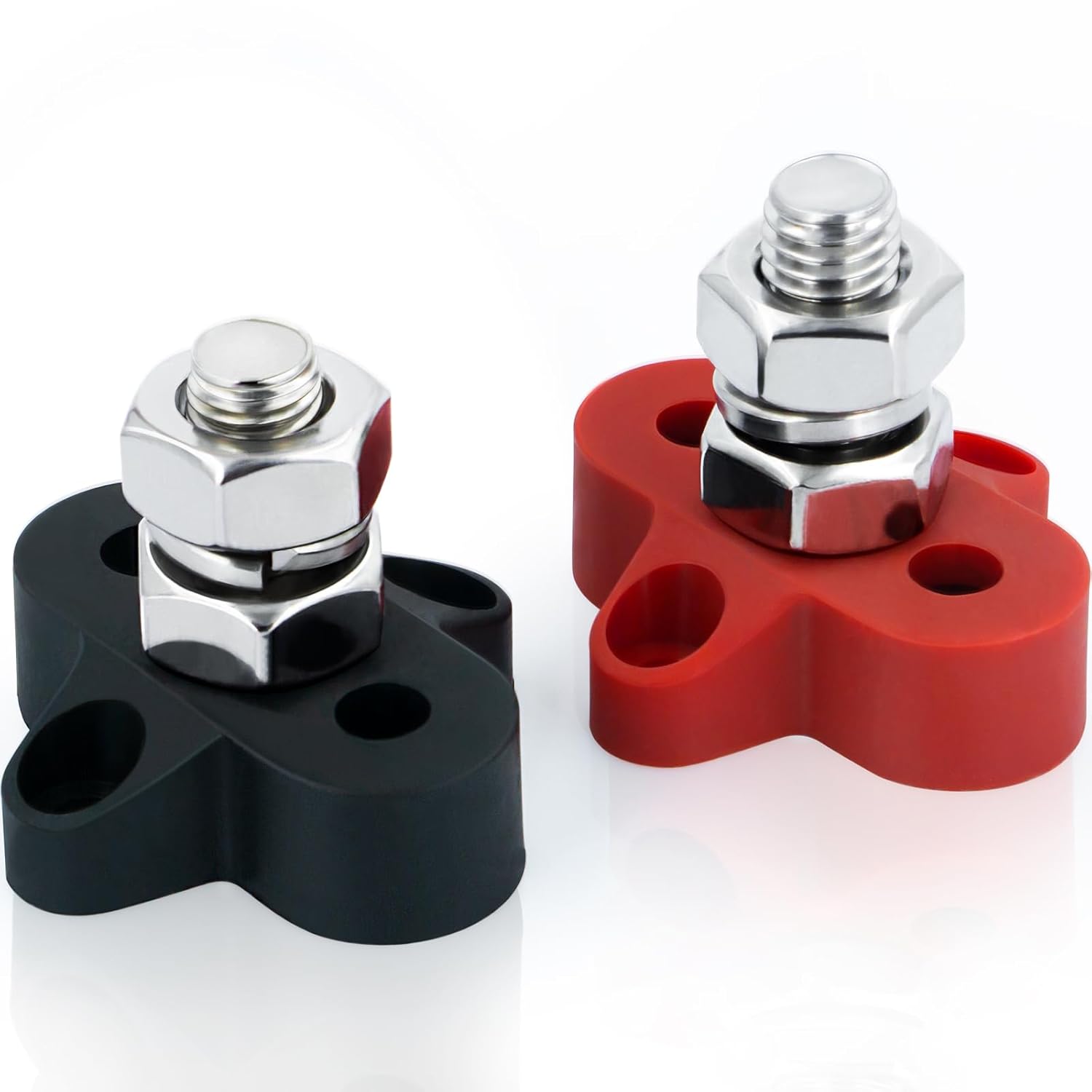 This is a set of simple terminal blocks for connecting to, or branching out from, your positive and negative battery terminals/feed cables. These are well made to insulate the connections from the mounting surface, and the threaded posts and nuts fit as they should for a 5/16″ terminal hole, and can be tightened down sufficiently firmly without stripping or breaking the base. They come with 4 small screws to attach the base to your mounting surface. I wanted to use some very small allen bolts and self locking nuts instead, and the mounting holes in these were a bit too small,. Although there is not a lot of meat around the mounting hole area in the base, I was able to drill them out with a slightly larger drill bit, and then countersink them with a slightly larger yet bit so they were just open enough to allow my small allen head bolts to work and sit flat on the base mounting holes. They work as intended, and seem well enough manufactured to get 5 Stars, and a recommendation as being good enough quality and value to purchase them.