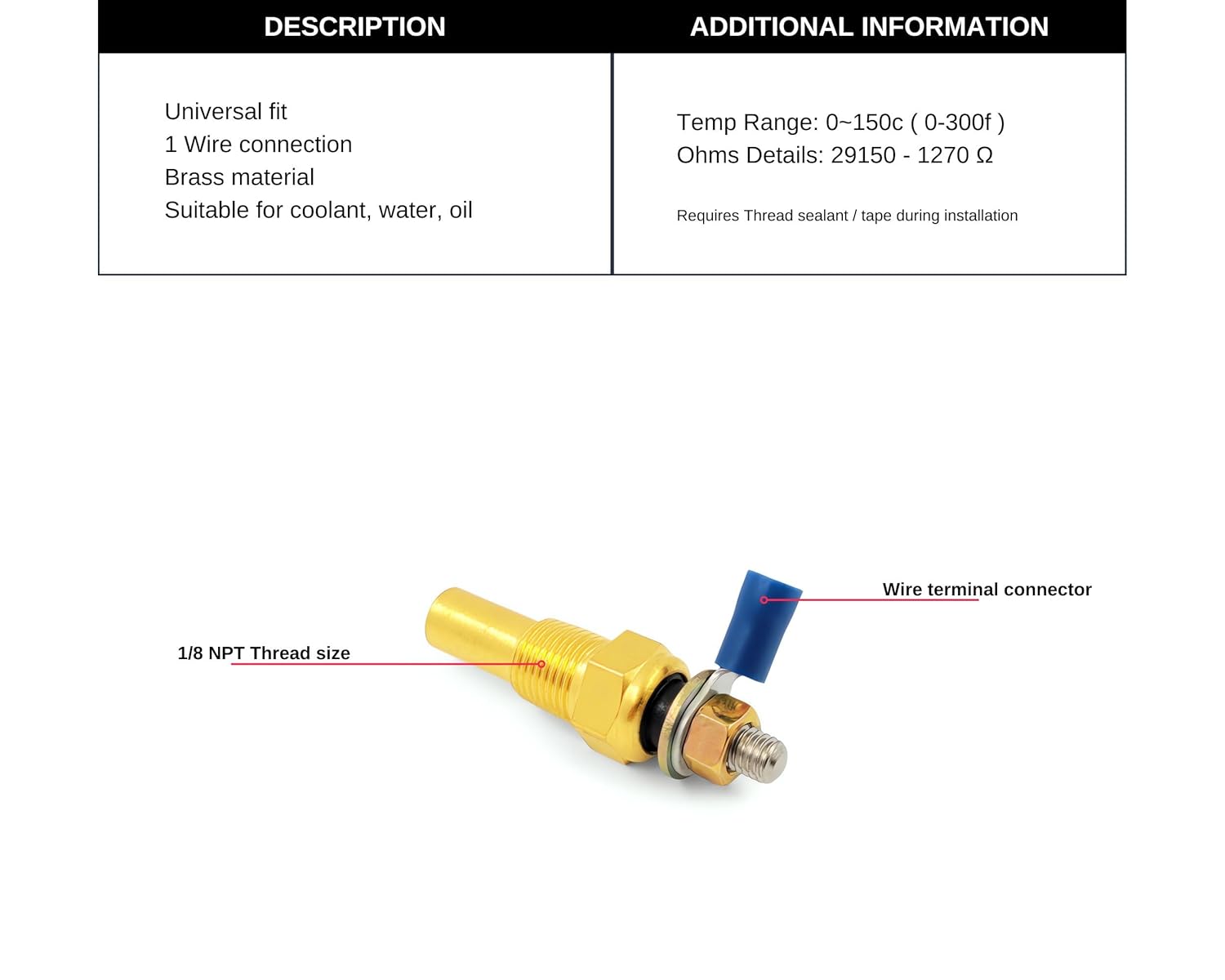 Construído em latão sólido, o sensor possui uma rosca de 1/8 NPT, o que proporciona uma instalação universal e fácil em diversos tipos de veículos e equipamentos. Sua construção robusta garante durabilidade e resistência a condições adversas, tornando-o uma escolha superior em comparação a outros sensores disponíveis no mercado. A precisão na medição da temperatura é crucial para evitar superaquecimentos e garantir a eficiência do motor, e este sensor se destaca por sua confiabilidade e desempenho.