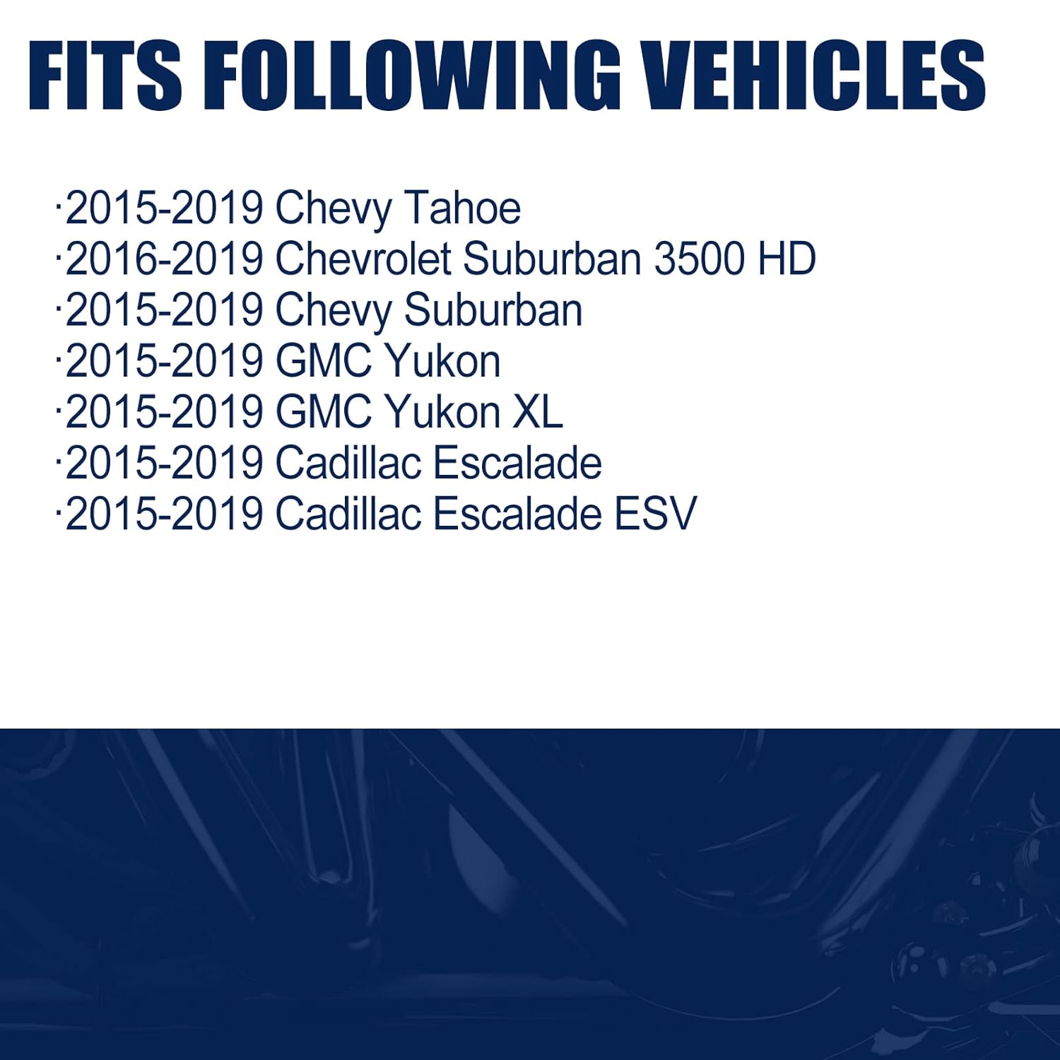 Resposta: Este produto é especificamente compatível com os modelos listados, incluindo Chevy Tahoe, Suburban, GMC Yukon e Cadillac Escalade de 2015 a 2019.