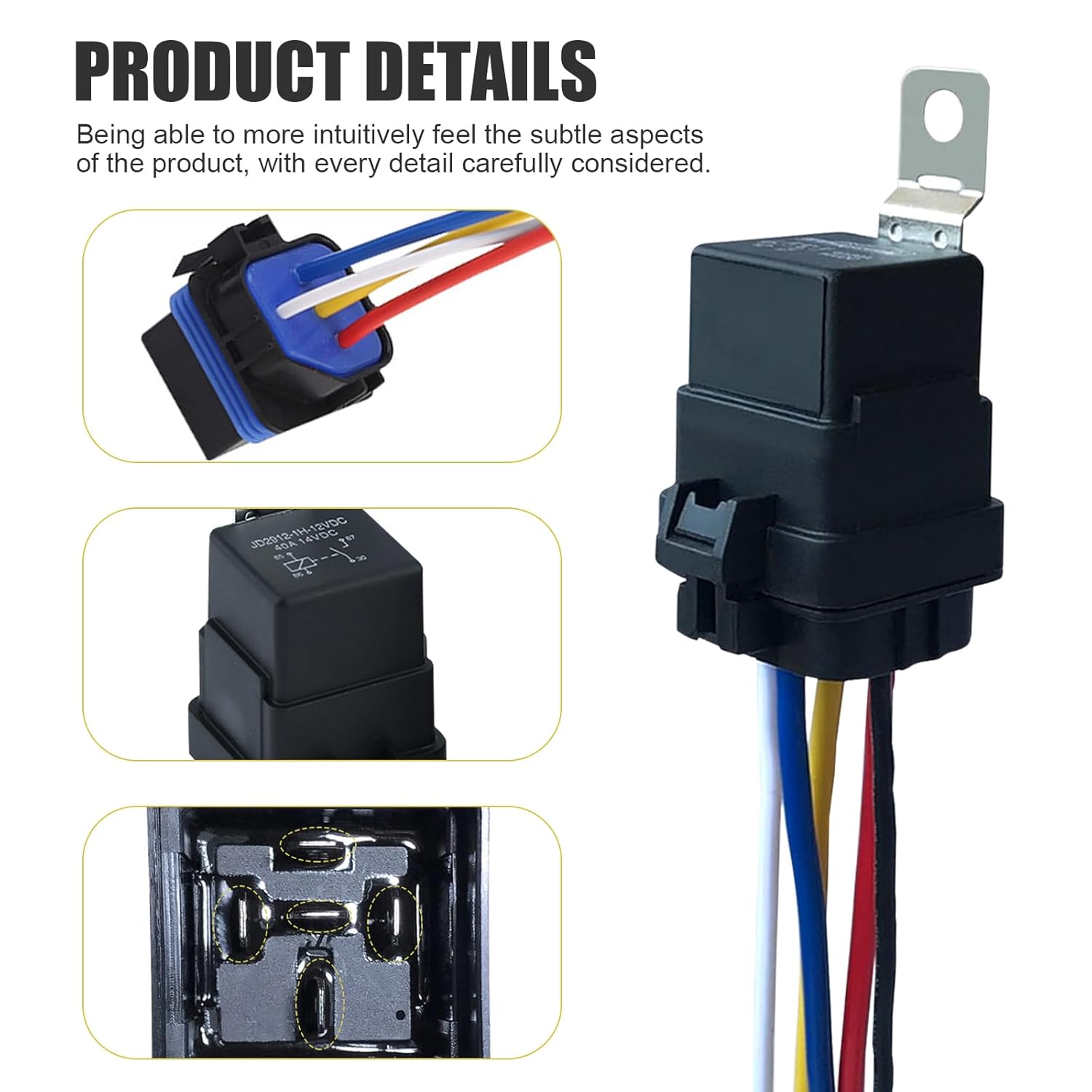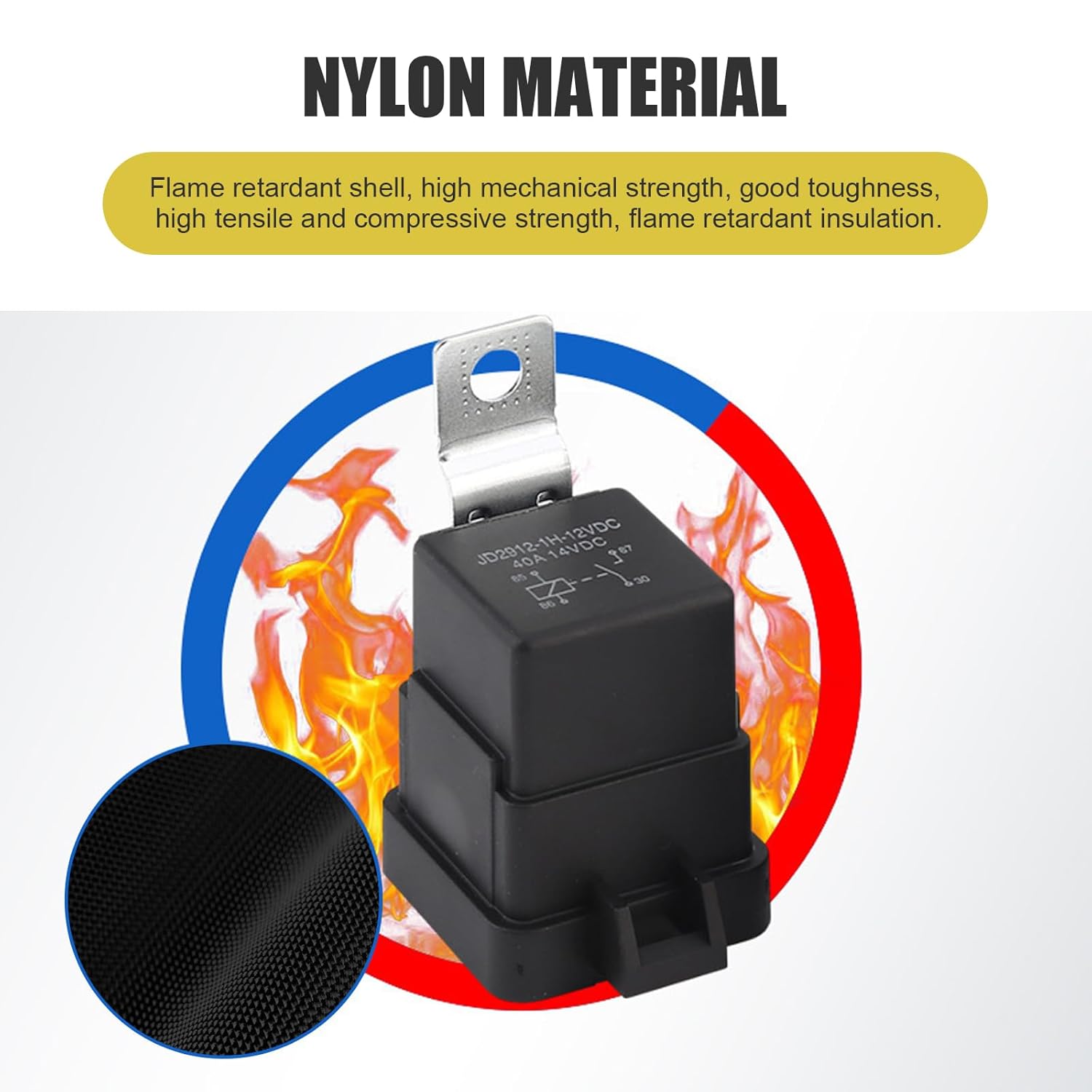 O pacote inclui um relé automotivo de 12V DC com 5 pinos e capacidade de 40A. É importante ter cuidado ao inserir o relé no soquete, pois a aplicação de força excessiva pode dobrar o conector fêmea. A carcaça do relé é feita de nylon retardante de chama de alta qualidade, com uma superfície lisa e durável, que apresenta boa resistência ao impacto e à deformação.