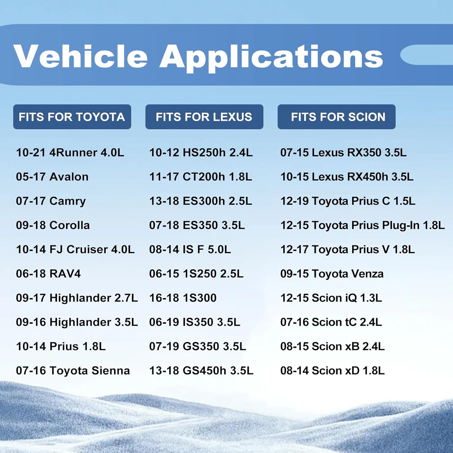 - Compatibilidade: Compatível com modelos como HS250h (2010-2012), CT200h (2011-2017), ES300h (2013-2017), ES350 (2007-2017), GS350, Camry, IS F XD (2008-2014), IS250 (2006-2015), IS300 (2016-2017), IS350 (2006-2017), GS450h (2013-2018), RX350 (2007-2015), entre outros. Verifique os modelos detalhados na descrição do produto abaixo.