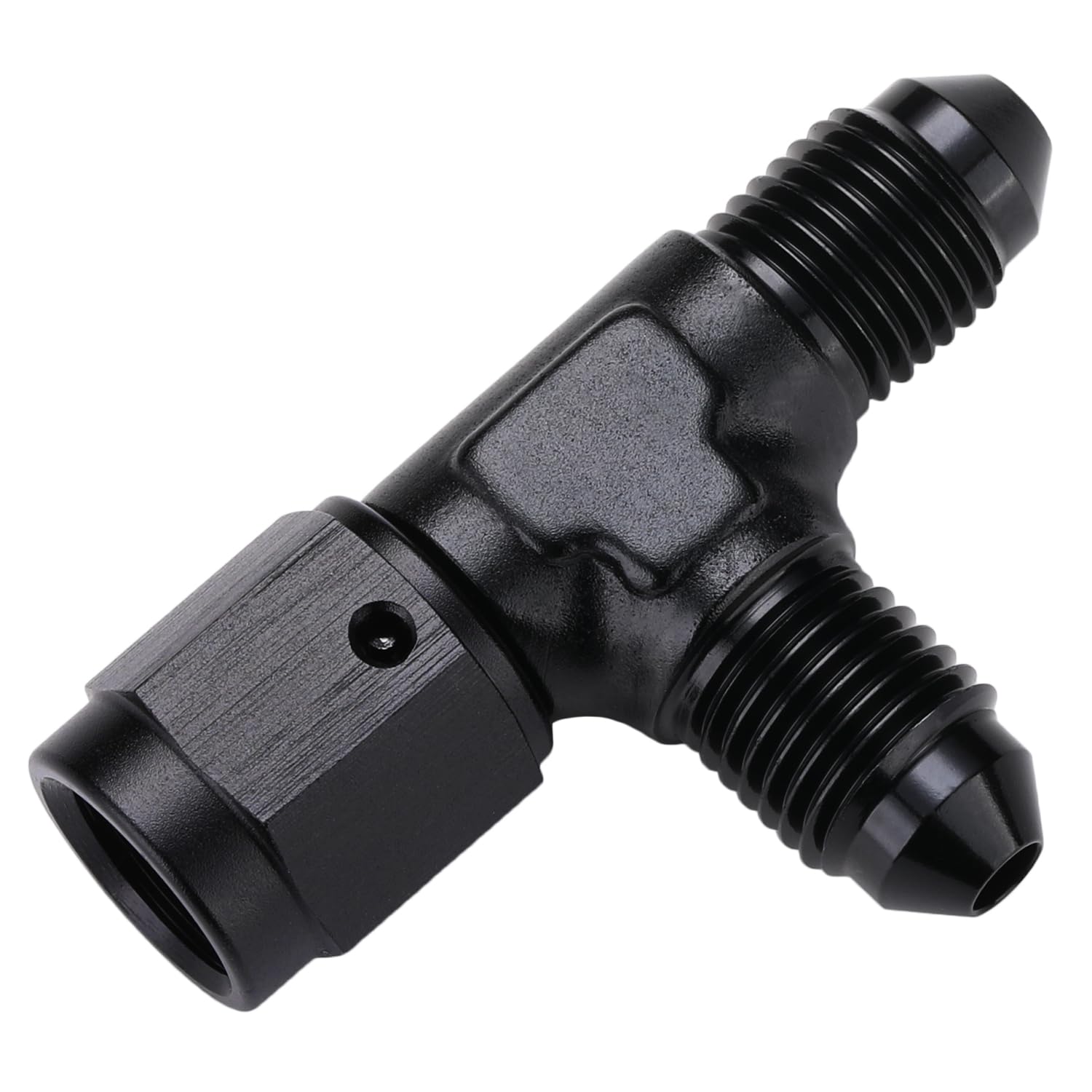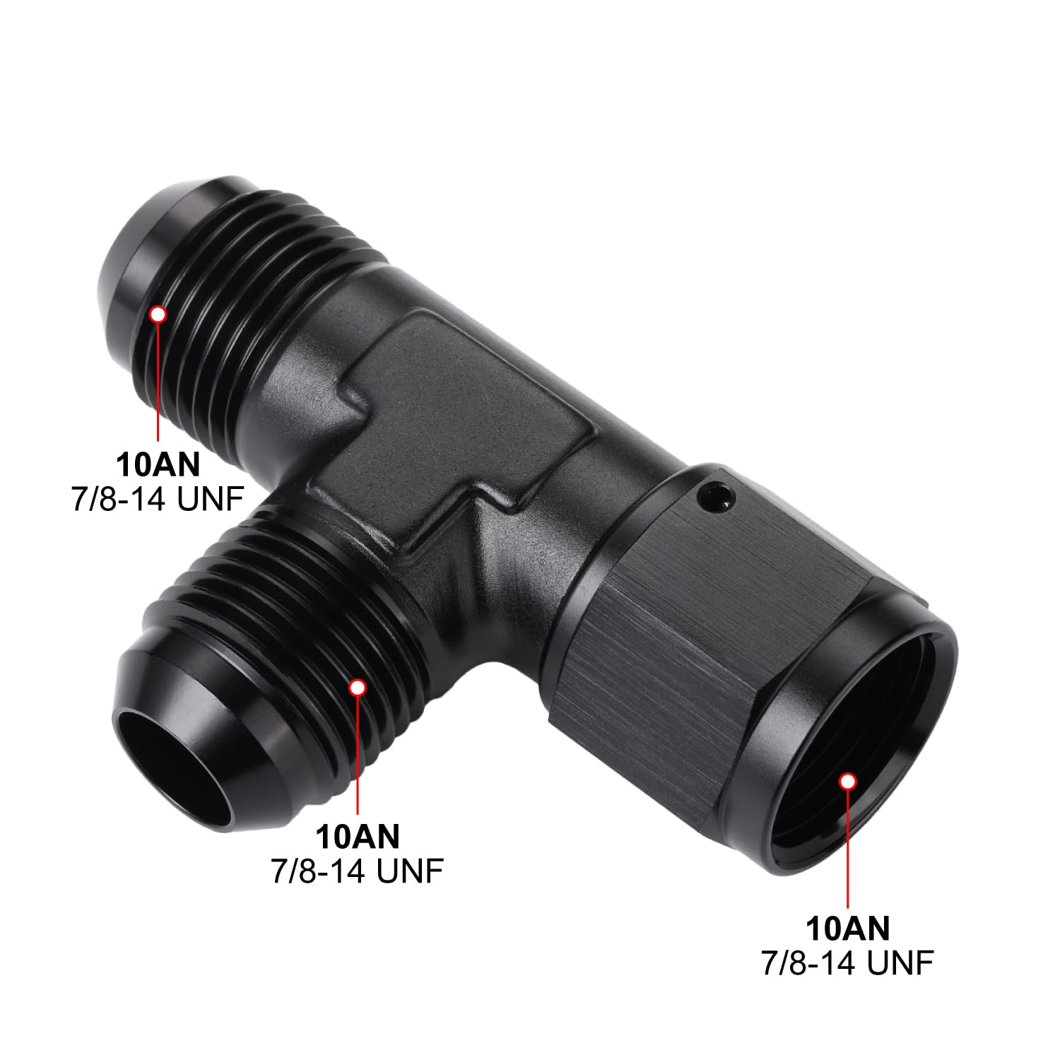 O adaptador 10AN Male Flare Tee T Fitting com AN10 Female Swivel On Run em alumínio preto é a solução ideal para quem busca eficiência e confiabilidade em sistemas automotivos. Com um design robusto e funcional, este fitting é fabricado em alumínio billet 6061-T6, um material leve e resistente, que garante durabilidade e resistência à corrosão, graças ao seu acabamento anodizado. O tamanho AN10 (7/8×14 UNF) do fitting macho, combinado com a rosca fêmea giratória, proporciona uma instalação fácil e segura, permitindo uma flexibilidade superior nas conexões.