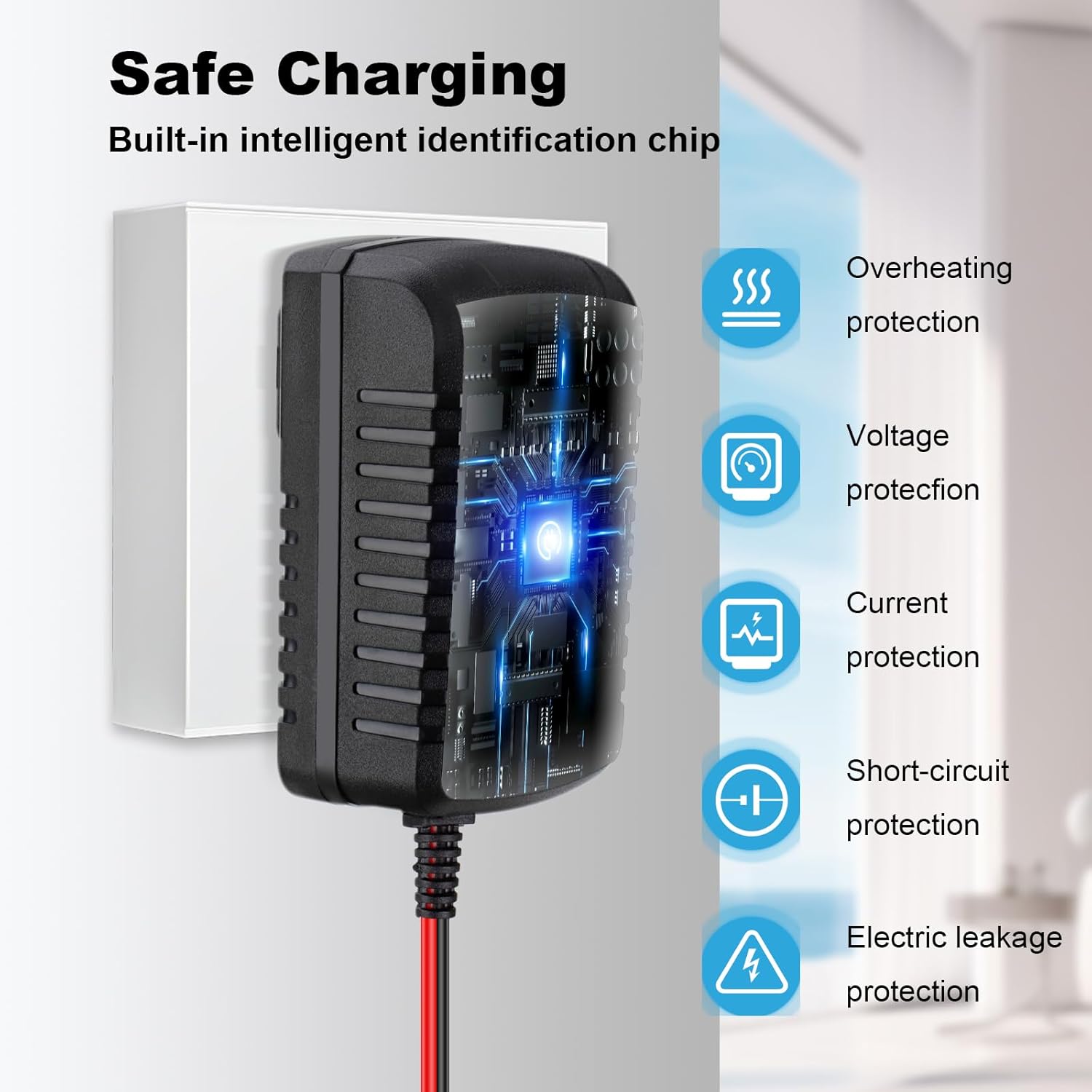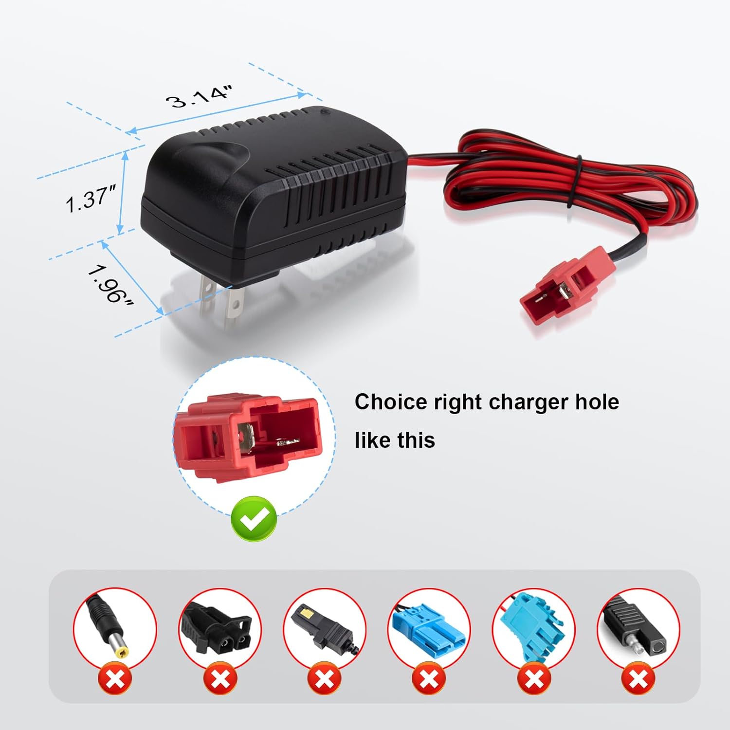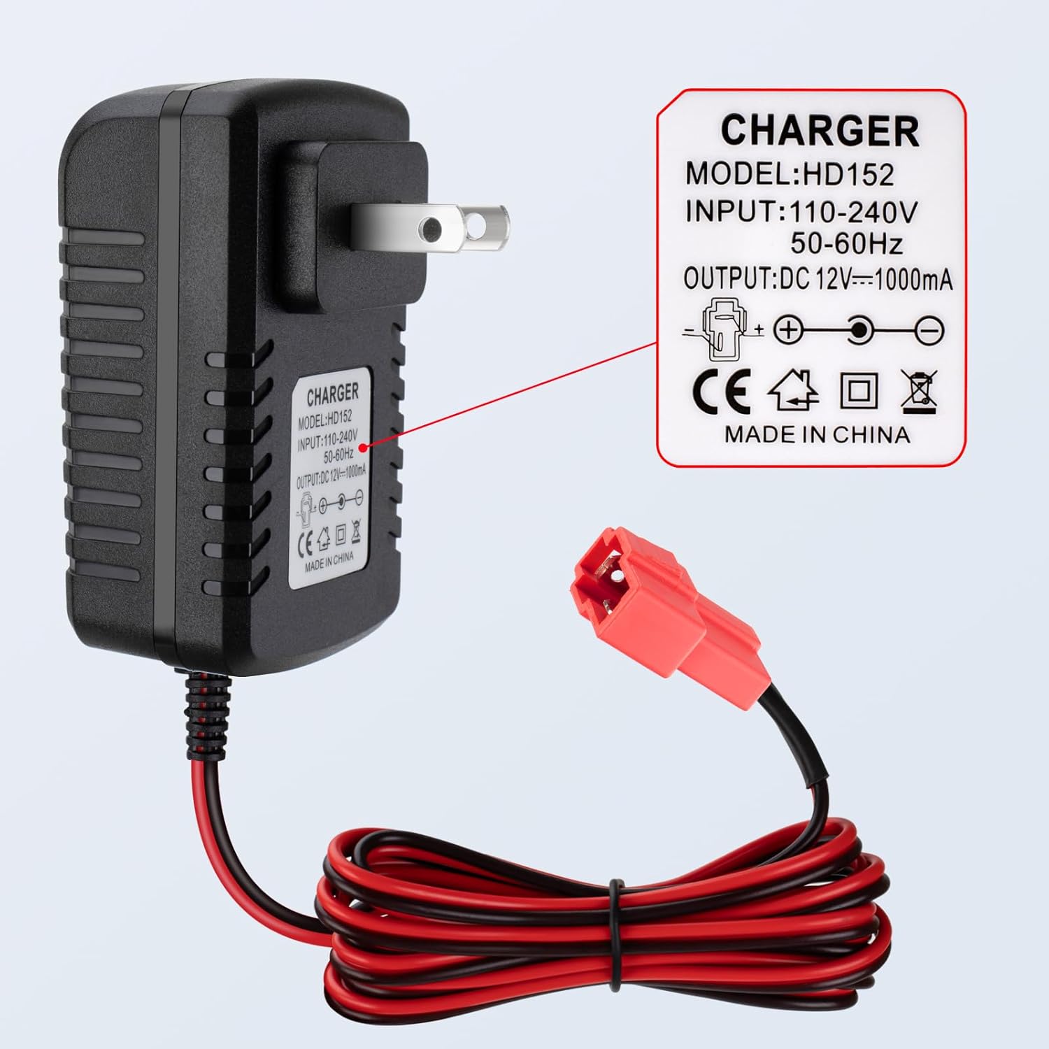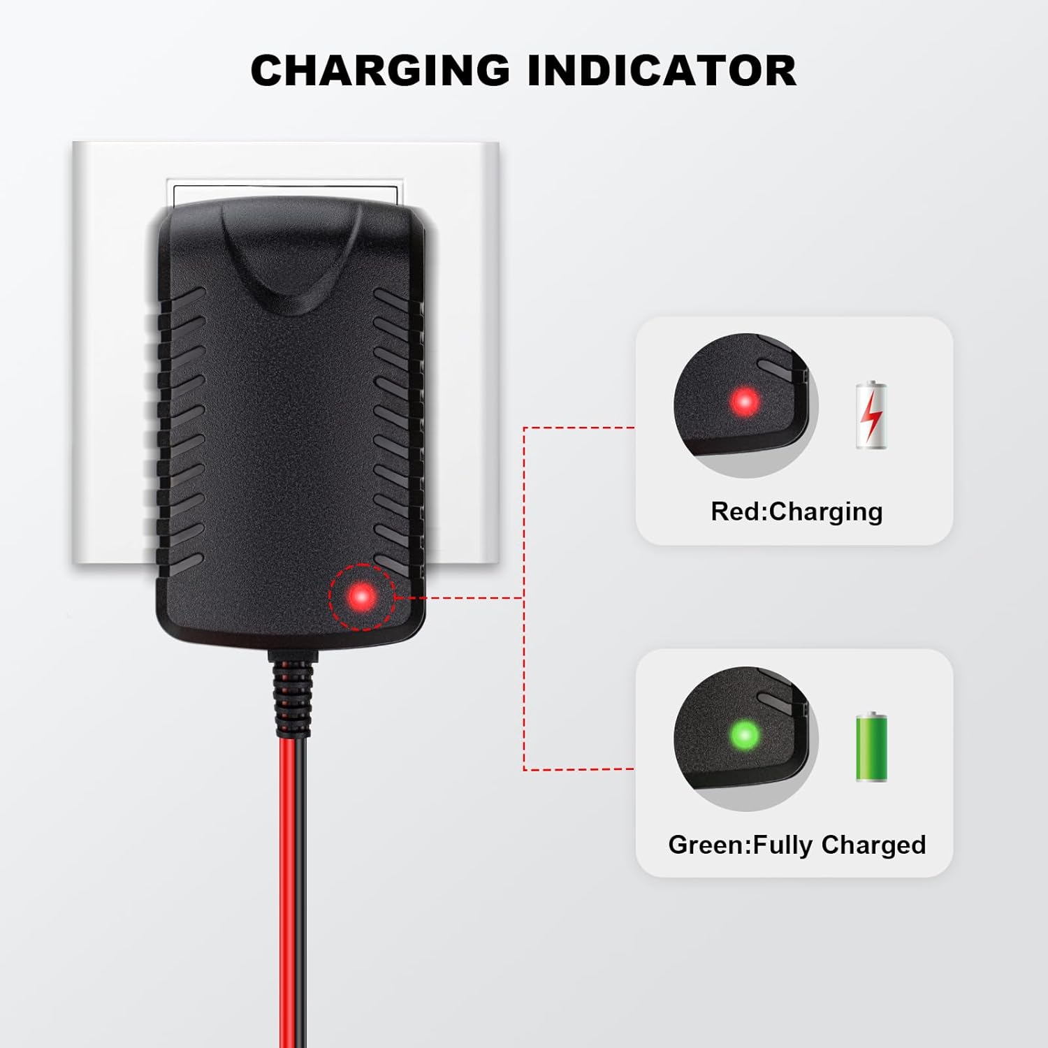 O cabo de alimentação de 5,5 pés proporciona flexibilidade durante o uso, enquanto o plugue quadrado vermelho é projetado para se encaixar perfeitamente nas portas de carregamento dos brinquedos elétricos. O carregador também conta com um display LED que indica o status da carga: luz vermelha durante o carregamento e luz verde quando a bateria está totalmente carregada. Isso facilita o monitoramento do processo de carregamento, garantindo que os pais possam acompanhar a segurança e a eficiência do carregador.