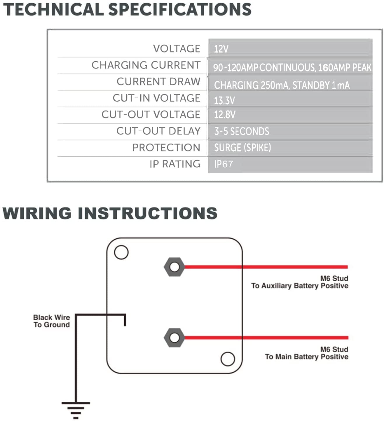 A critical piece of information (missing from product description)- this one is a DUAL VSR, means it senses voltage on both ends. There is no primary or secondary end, both ends can activate bypass relay. For my project I wanted true insolation to be able to charge house battery independently from starter one and this product does not meet my needs, because once I activate charger on a secondary house battery it closes the bypass and now I’m charging both starter and house batteries together. I need one which has red marking on one end, truly single VSR for dual battery setup.