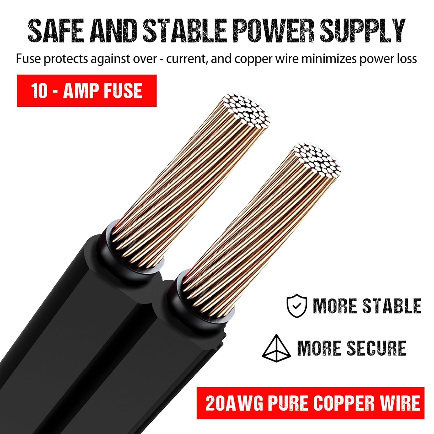 A segurança e a estabilidade na transmissão de energia são garantidas por um fusível de 10 ampères e fios de cobre puro 20AWG, que minimizam a perda de energia. Este cabo pode suportar até 120W, proporcionando uma fonte de energia confiável para o seu refrigerador de carro. Com um comprimento de aproximadamente 1,8 metros (5,9 pés), você pode posicionar seu cooler de forma conveniente, seja no banco de trás ou no porta-malas, facilitando o acesso à fonte de energia.