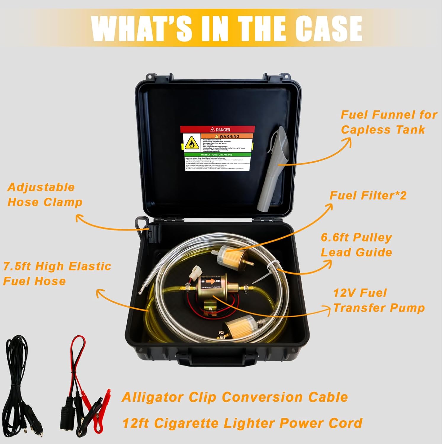 Complete gas transfer pump system. Very well done! Heavy duty case with pump MOUNTED in the case. All components look quality and I have had no problems. The one thing that would help would be a little longer pick-up tubing, and a couple more feet of 12V cord to cig lighter plug. Neither issue is major, and I would defiantly recommend. I usually use to fuel my pontoon boat, without trying to hold a 5 gal gas can slowly pour out in an awkward position (for my back)….and spilling fuel in the water. This pump solves these problems for me.