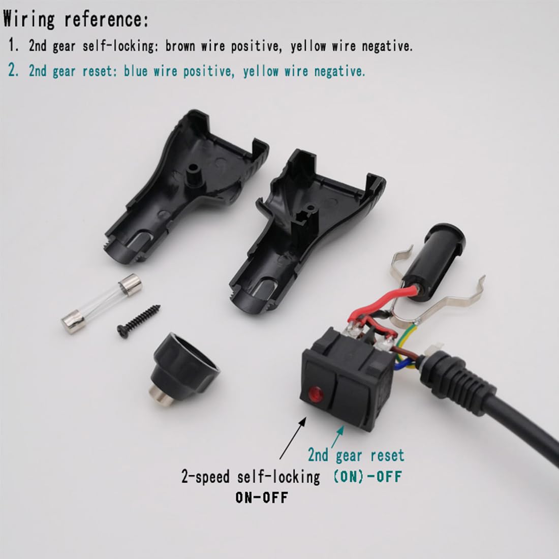 O plugue deste interruptor possui um sistema de 2 posições, permitindo um controle preciso com um interruptor de 2 velocidades que se auto-bloqueia. A fiação é simples e direta, com um fio positivo marrom e um fio negativo amarelo, garantindo uma instalação rápida e segura. Além disso, o interruptor conta com um sistema de reset de 2 velocidades, onde a função (on) – off é controlada por um fio positivo azul e um fio negativo amarelo.