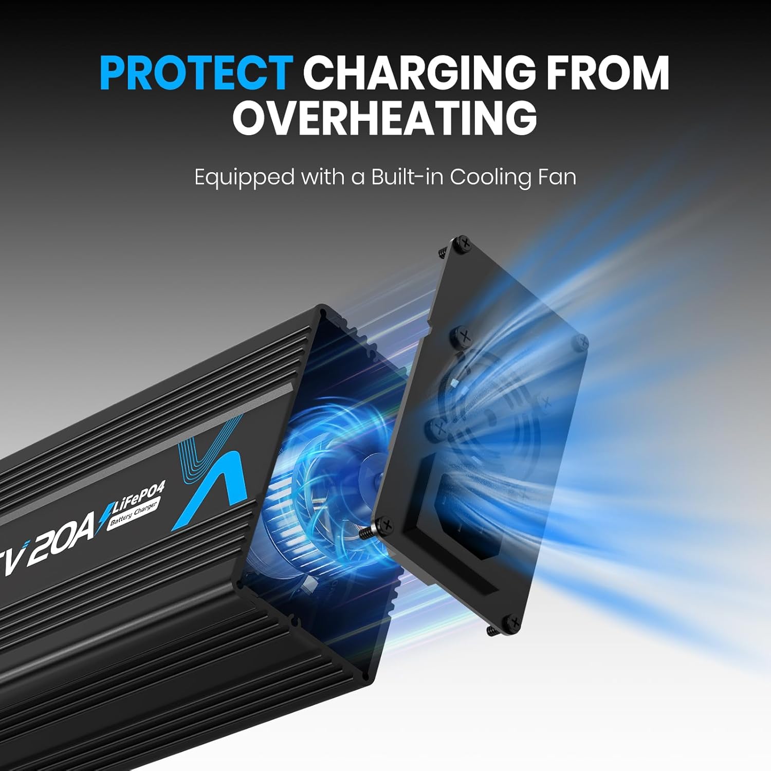 - Ampla Voltagem e Boa Dissipação de Calor: Com uma ampla faixa de voltagem de entrada e múltiplas características de proteção, o carregador apresenta alta confiabilidade. O ventilador embutido melhora a dissipação de calor, garantindo que o carregador opere em condições ideais. O Carregador Inteligente 14.6V 20A é projetado especificamente para baterias LiFePO4 de 12V, maximizando o desempenho da bateria e prolongando sua vida útil.