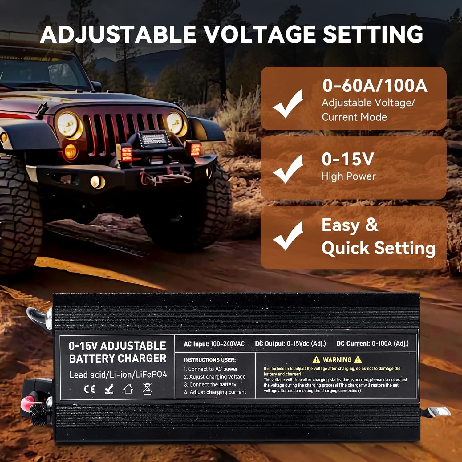 – Corrente: Ajustável de 0 a 100A.