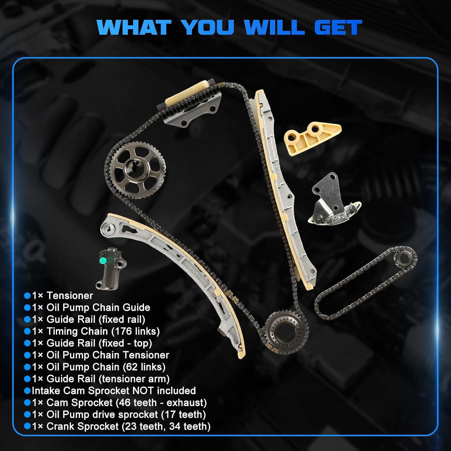 - 📦 PACOTE INCLUINDO: O kit inclui 1 Corrente de Distribuição (176 elos), 1 Engrenagem de Comando (46 dentes – escape), Engrenagem de Comando de Admissão NÃO incluída, 1 Engrenagem do Virabrequim (23 dentes, 34 dentes), 1 Trilho Guia (fixo – superior), 1 Trilho Guia (trilho fixo), 1 Trilho Guia (braço tensionador), 1 Tensionador, 1 Corrente da Bomba de Óleo (62 elos), 1 Engrenagem de acionamento da Bomba de Óleo (17 dentes), 1 Guia da Corrente da Bomba de Óleo e 1 Tensionador da Corrente da Bomba de Óleo.