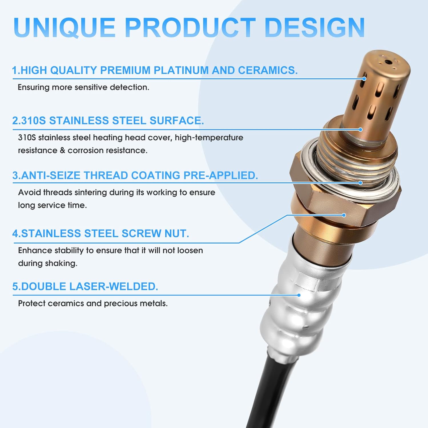 Aquecedor de Ação Rápida: O sensor possui um aquecedor de ação rápida que otimiza sua funcionalidade, permitindo que o sensor atinja a temperatura operacional em apenas alguns segundos. Isso resulta em um desempenho ideal e respostas rápidas às variações de oxigênio no sistema de exaustão.