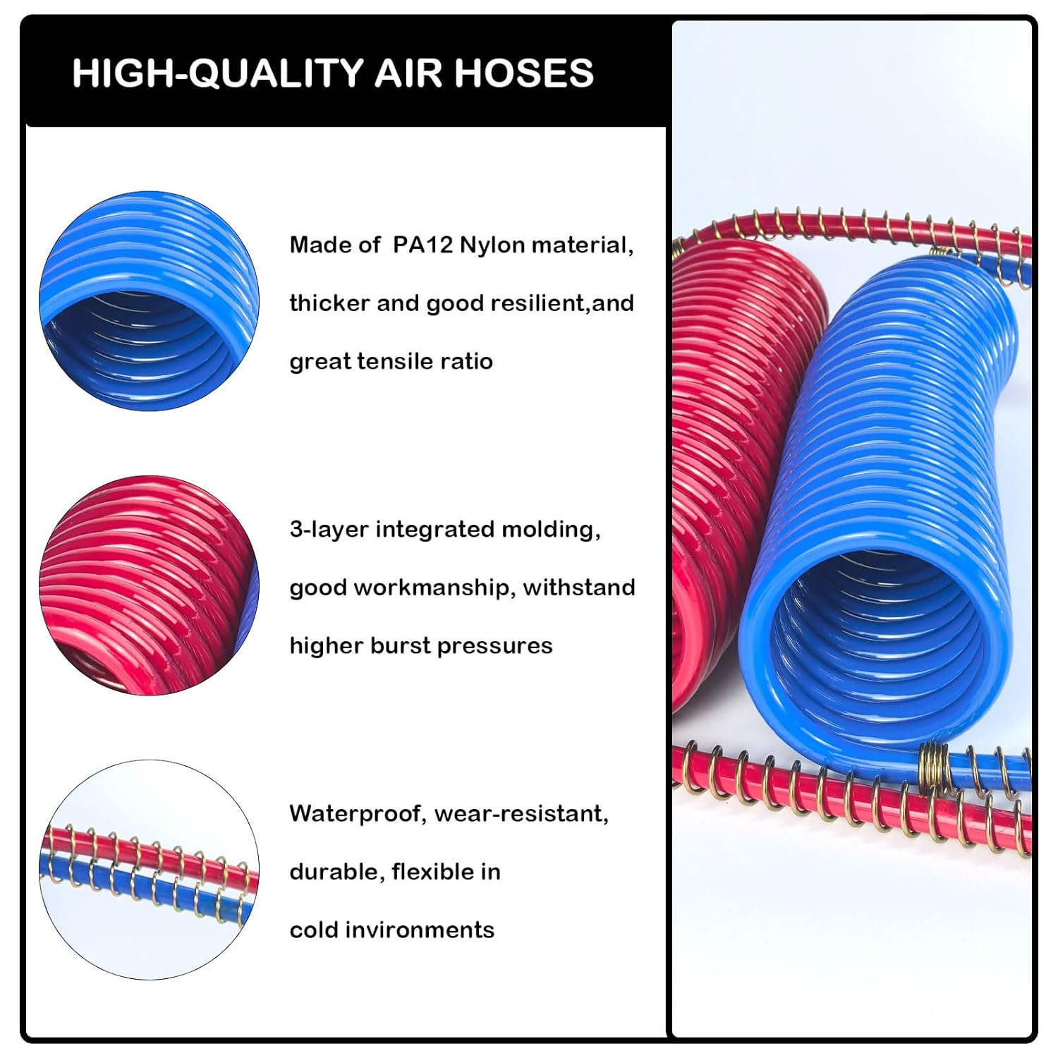 Apresentamos a montagem de mangueiras de freio a ar em espiral de 15 pés com 40 polegadas, uma solução robusta e confiável para sistemas de freio de caminhões pesados. Fabricada com material de nylon PA12 de alta qualidade, nossa mangueira de freio a ar se destaca pela sua espessura superior e qualidade inigualável em comparação com outras opções disponíveis no mercado. Com um molde integrado de 3 camadas e espessura uniforme, esta mangueira oferece excelente flexibilidade, resistência ao desgaste e não endurece em condições climáticas frias, garantindo desempenho consistente em qualquer situação.
