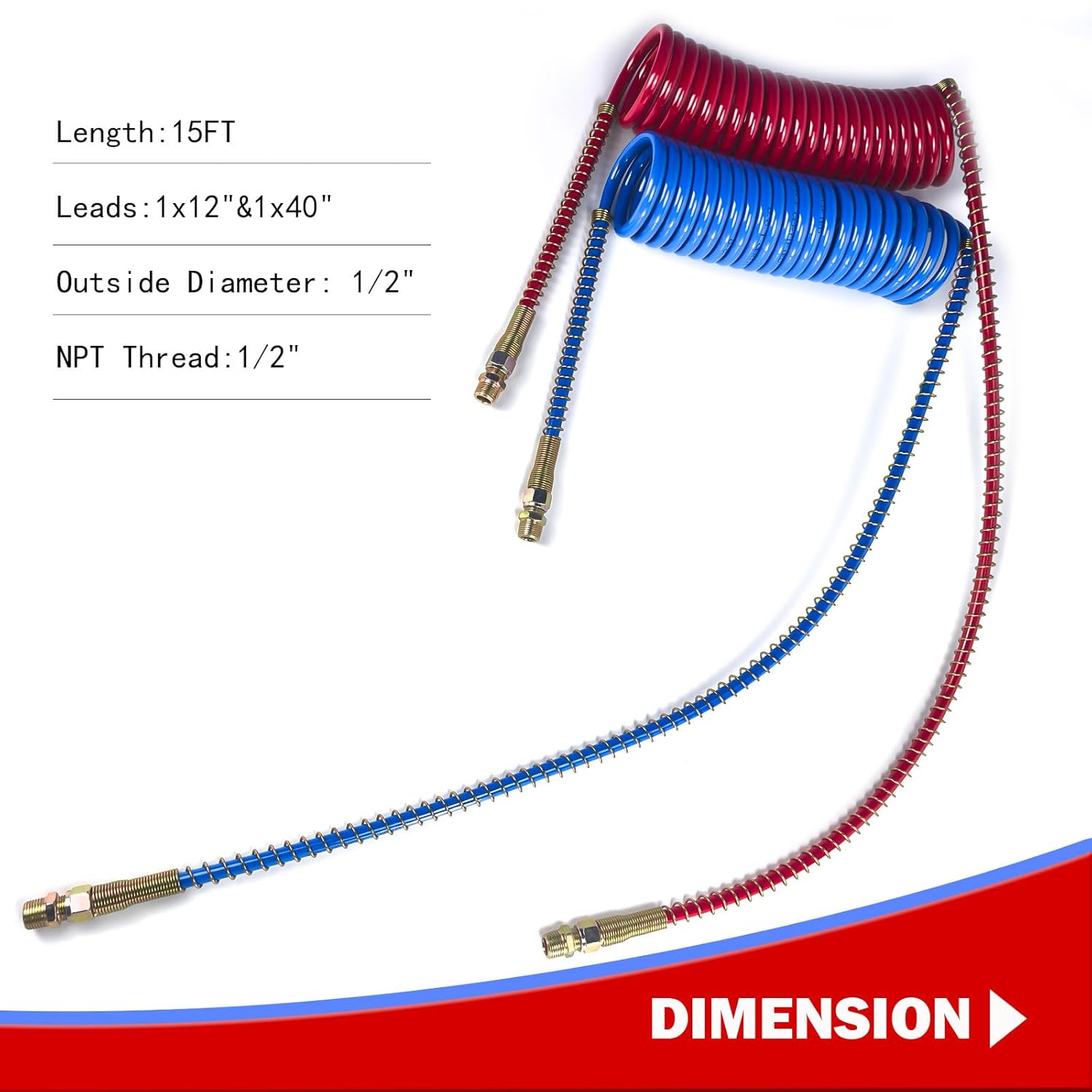 Com dimensões precisas, a mangueira de freio a ar possui um comprimento total de 15 pés, com um comprimento de trator de 40 polegadas e um comprimento de reboque de 12 polegadas. Os conectores de latão DOT possuem rosca NPT de 1/2 polegada, garantindo uma conexão sólida e duradoura.