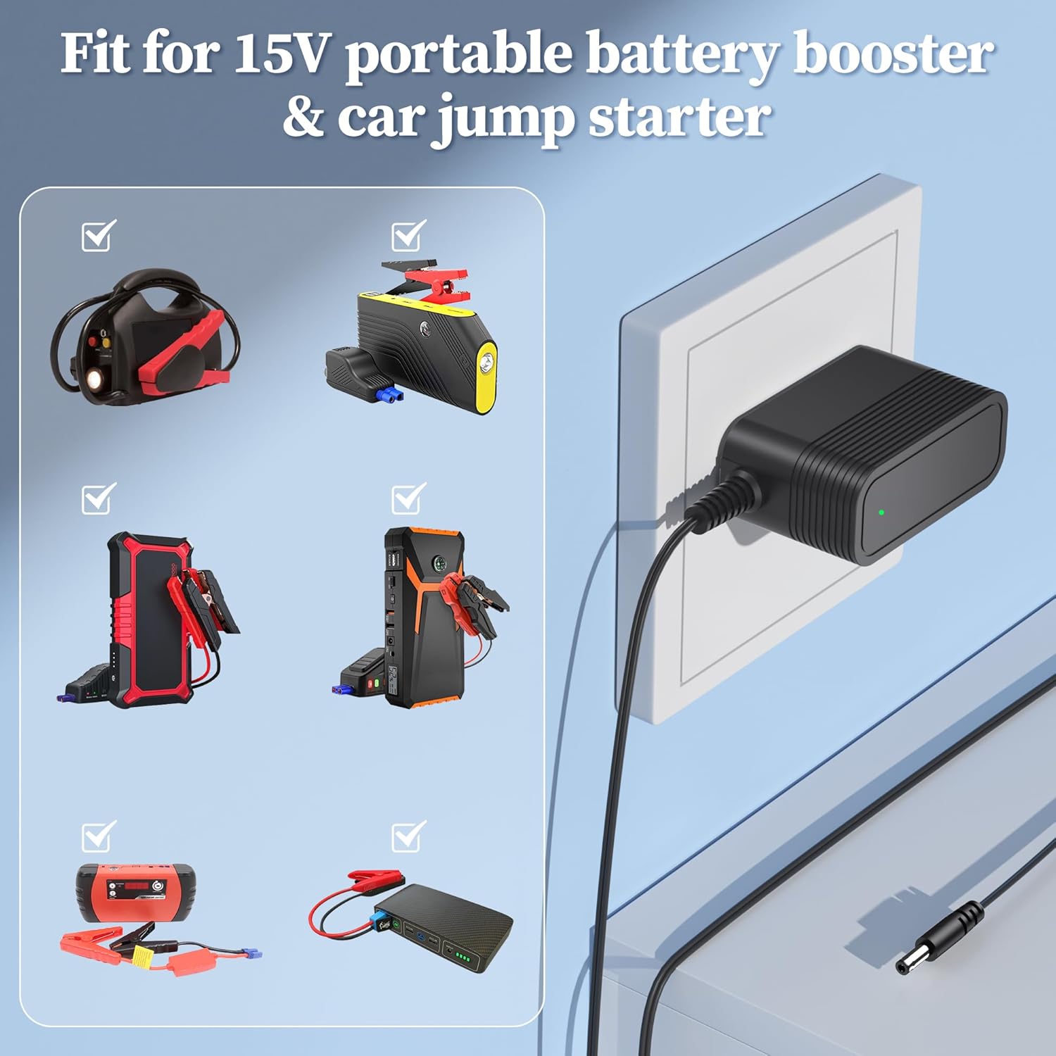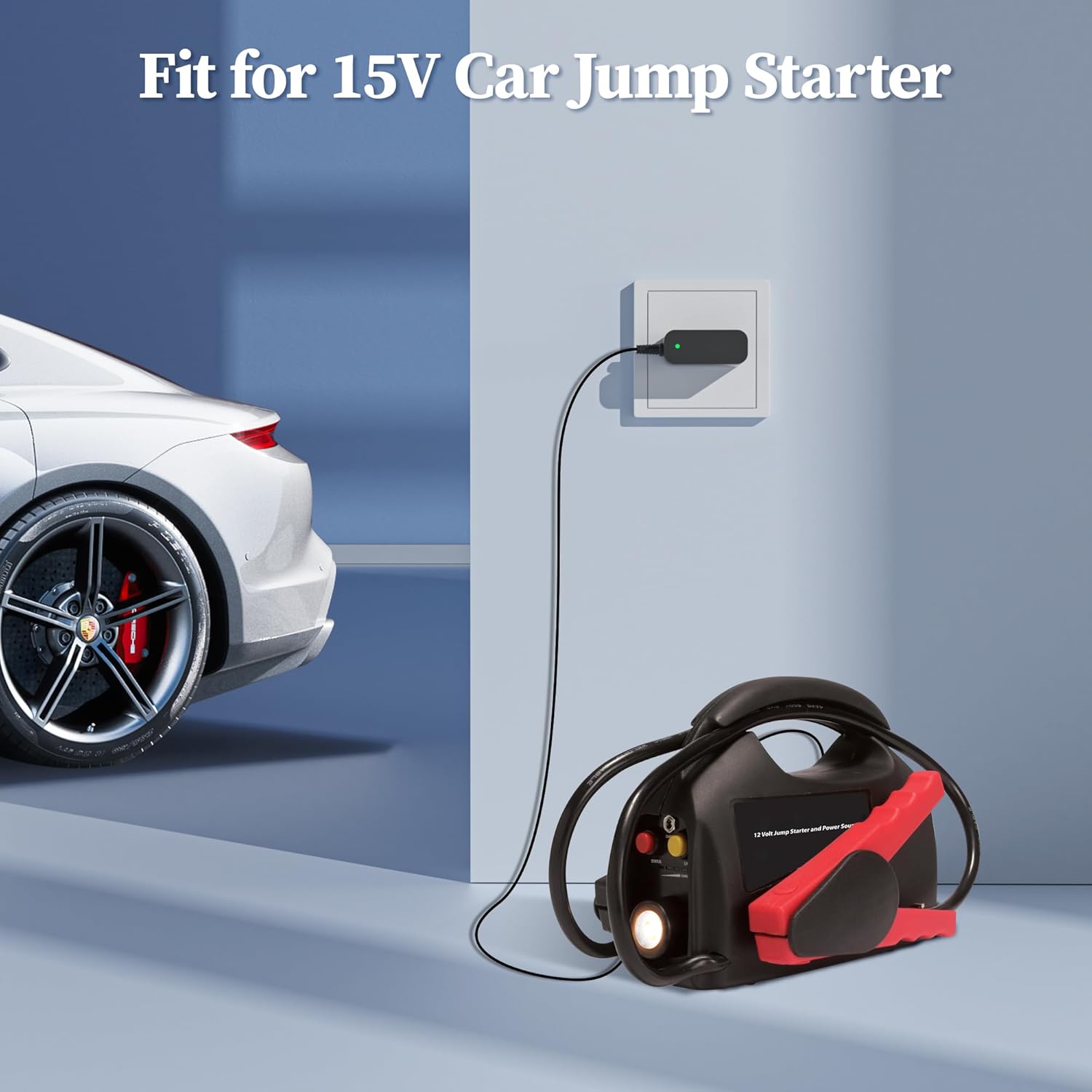 Carregador de 15V 1A para Jump Starter, ideal para fornecer energia a dispositivos de partida de bateria automotiva com picos de 450A a 1000A. Compatível com modelos como TACKLIFE T6, DBPOWER DJS50 e GOOLOO. Oferece carregamento rápido e eficiente, garantindo que seu jump starter esteja sempre pronto para uso. Compacto e portátil, é perfeito para manter no carro, proporcionando segurança e praticidade em situações de emergência.