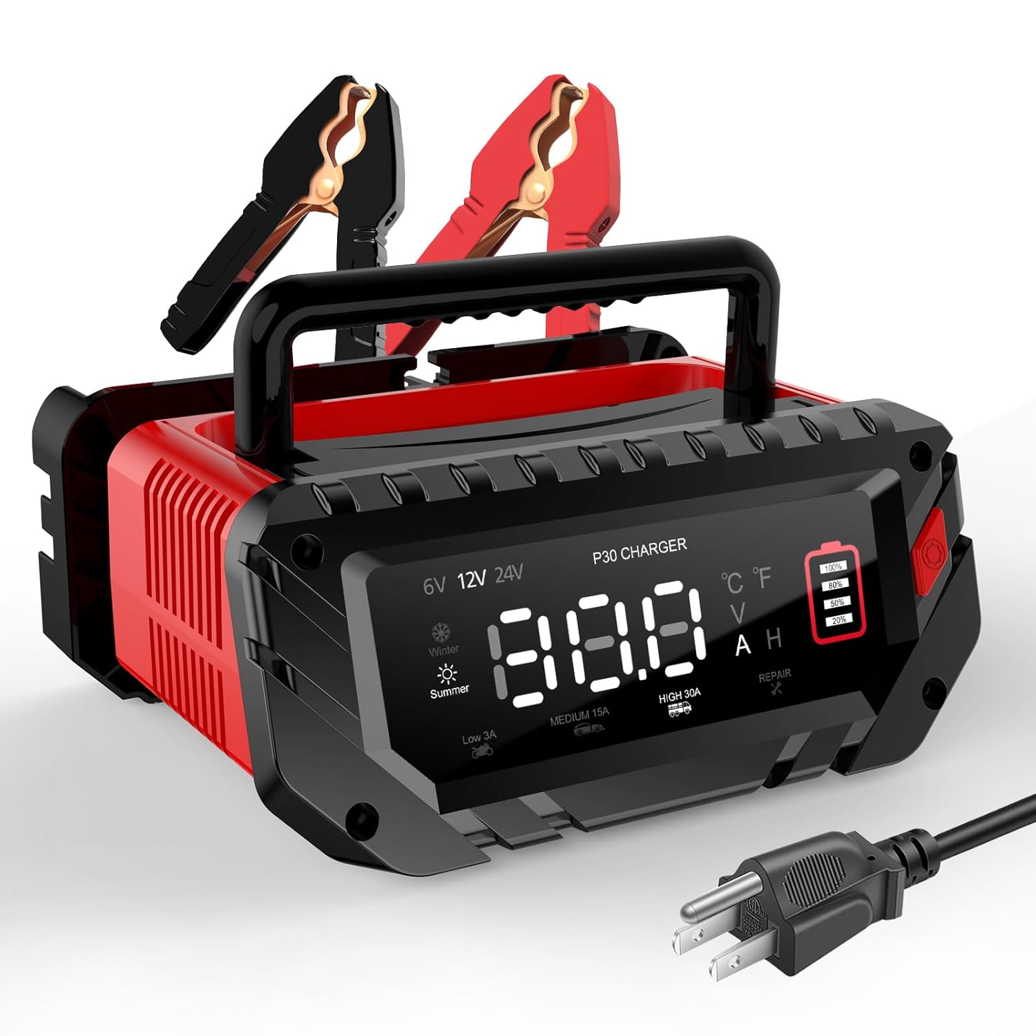 This 30-amp car battery charger is excellent! It’s super easy to use with its automatic smart charging feature. It works well for my car, motorcycle, and even my boat. The ability to charge 6V, 12V, and 24V batteries is a big plus. I love that it also acts as a battery maintainer and trickle charger. It’s perfect for lead-acid, lithium, and LiFePo4 batteries. Definitely a great investment for keeping my batteries in top condition!