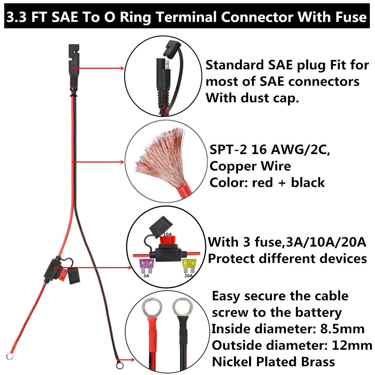 – SAE para Terminal em O: Este cabo de 3,3 pés, com diâmetro interno de 8,4 mm, é projetado para ser fixado de forma segura à bateria, sendo ideal para carregamentos prolongados e manutenção de bateria.