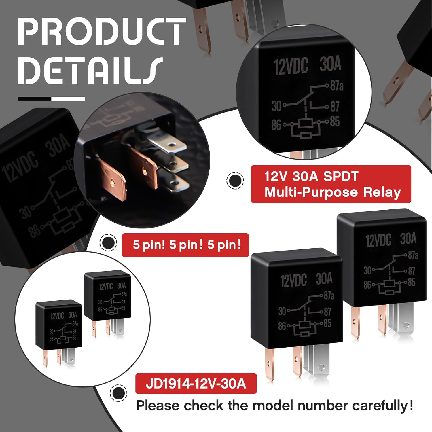 Os relés automotivos JD1914-12V-30A são práticos e versáteis, podendo ser aplicados em luzes traseiras, compartimentos de motor, ventiladores elétricos, bombas de água elétricas, bombas de combustível elétricas, solenóides de maçanetas e outros equipamentos. Com um design robusto e confiável, esses relés são a escolha perfeita para quem busca substituir ou atualizar os acessórios elétricos do seu carro.