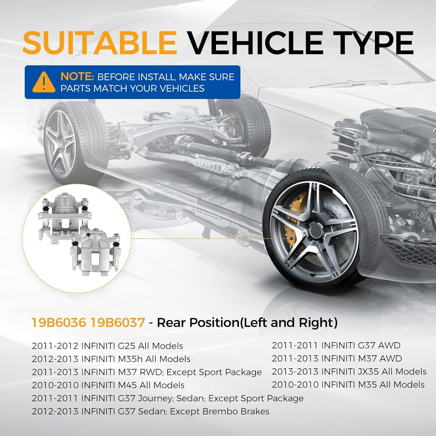 - 🚗 Compatibilidade do Veículo – O Caliper de Freio 19B6036 e 19B6037 é compatível com os seguintes modelos: INFINITI G25 (2011-2012), G37 (2011-2013), JX35 (2013), M35 (2010), M35h (2012-2013), M37 (2011-2013) e M45 (2010). É importante notar que não é compatível com pacotes esportivos ou sistemas de freio Brembo.