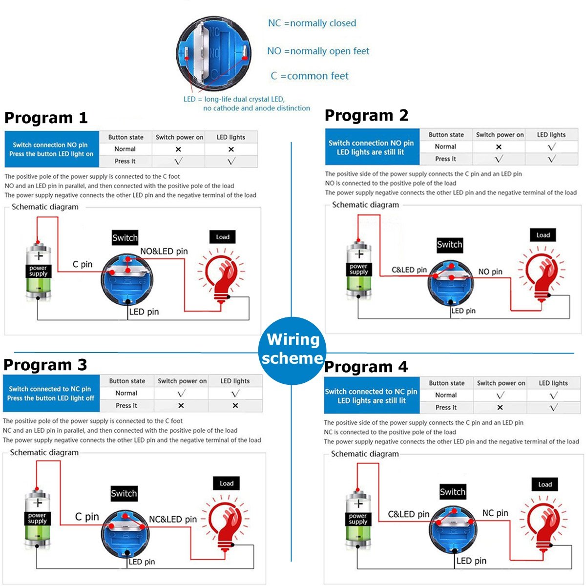 Wiring is exactly according to diagram in pictures. I took a screenshot of the diagram and wired accordingly. Diagram does not come with switch. It is in the pictures in description. Switch has aluminum body and is very well made. Illumination is nice and bright. This is a small low amperage switch so the lead wires are expectedly small. If you’re running a high amp load requiring 14AWG or some such larger wiring, you should use the switch to power a relay.