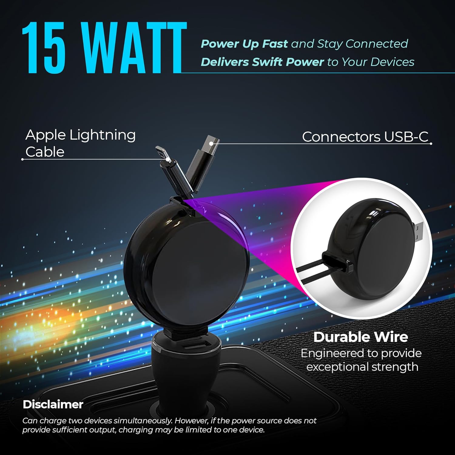 Mantenha seus dispositivos sempre carregados enquanto está em movimento com o Carregador Retrátil 2 em 1 da Swept, projetado para iPhone e Android. Este carregador de carro inovador possui um cabo retrátil que combina um cabo Lightning e um cabo de dados tipo C, oferecendo uma solução prática e eficiente para quem está sempre na estrada. Com uma potência de 15W, o carregador garante um carregamento rápido e seguro, ideal para os motoristas que não podem perder tempo.