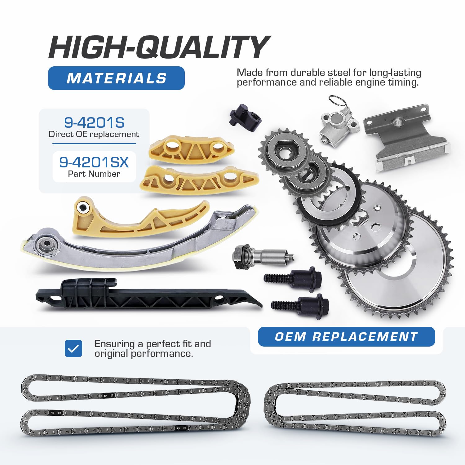 This timing chain set looks to be made well and has an excellent price. I did however find one problem. The main chain tensioner guide where it mounts was inserted backwards. I had to remove the retaining clip and reinstall it, I would say there is a possible quality control issue somewhere. Other than that everything else installed easily and mounted like the factory parts I replaced. It has been working perfectly for the past 4 months and no more annoying chain noise. I would highly recommend this kit to anyone needing their timing chains replaced!!!