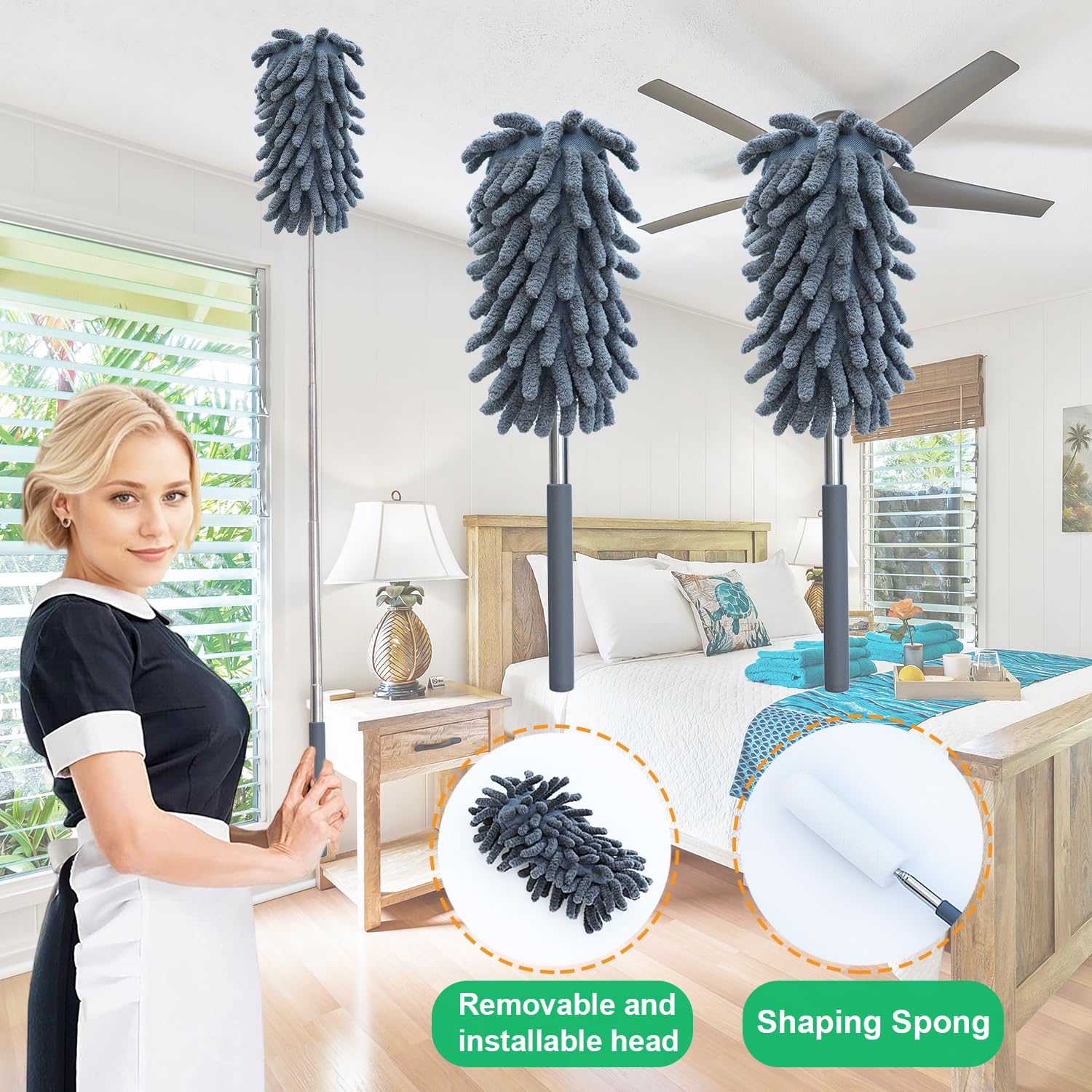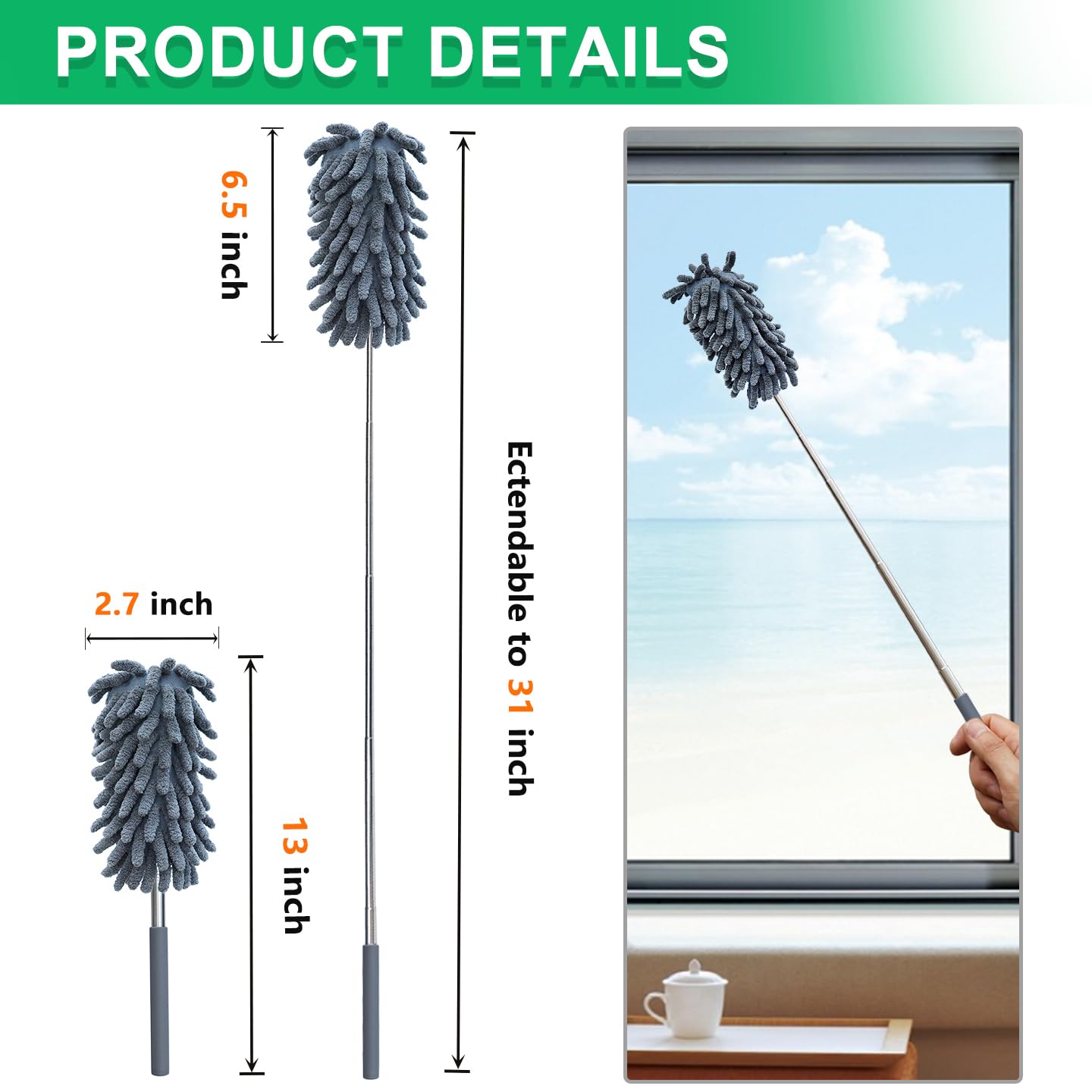 O duster possui um design telescópico ajustável que se estende até 30 polegadas, permitindo alcançar cantos e superfícies em diferentes alturas com facilidade. Quando não está em uso, ele pode ser dobrado, tornando-se compacto e fácil de armazenar, o que o torna uma ferramenta de limpeza conveniente para qualquer espaço.
