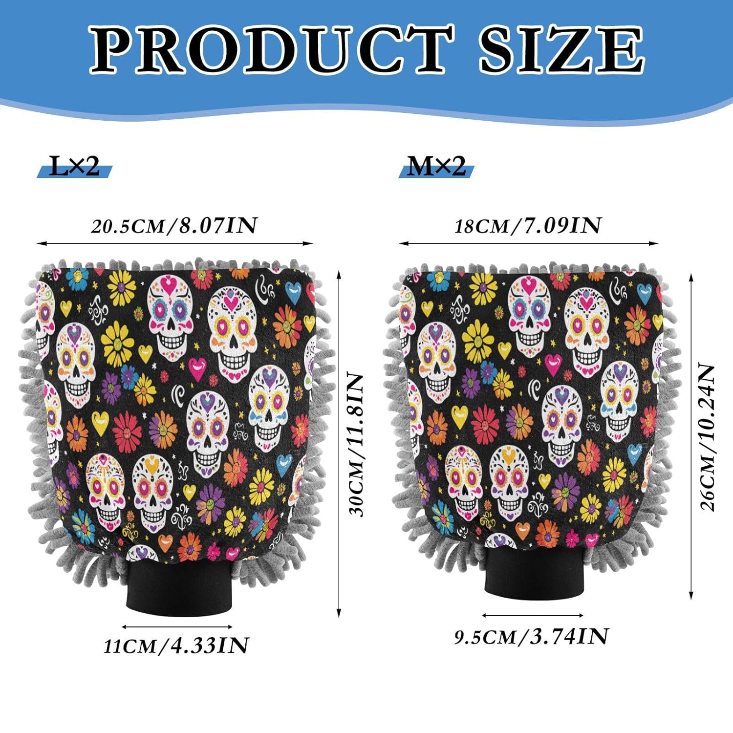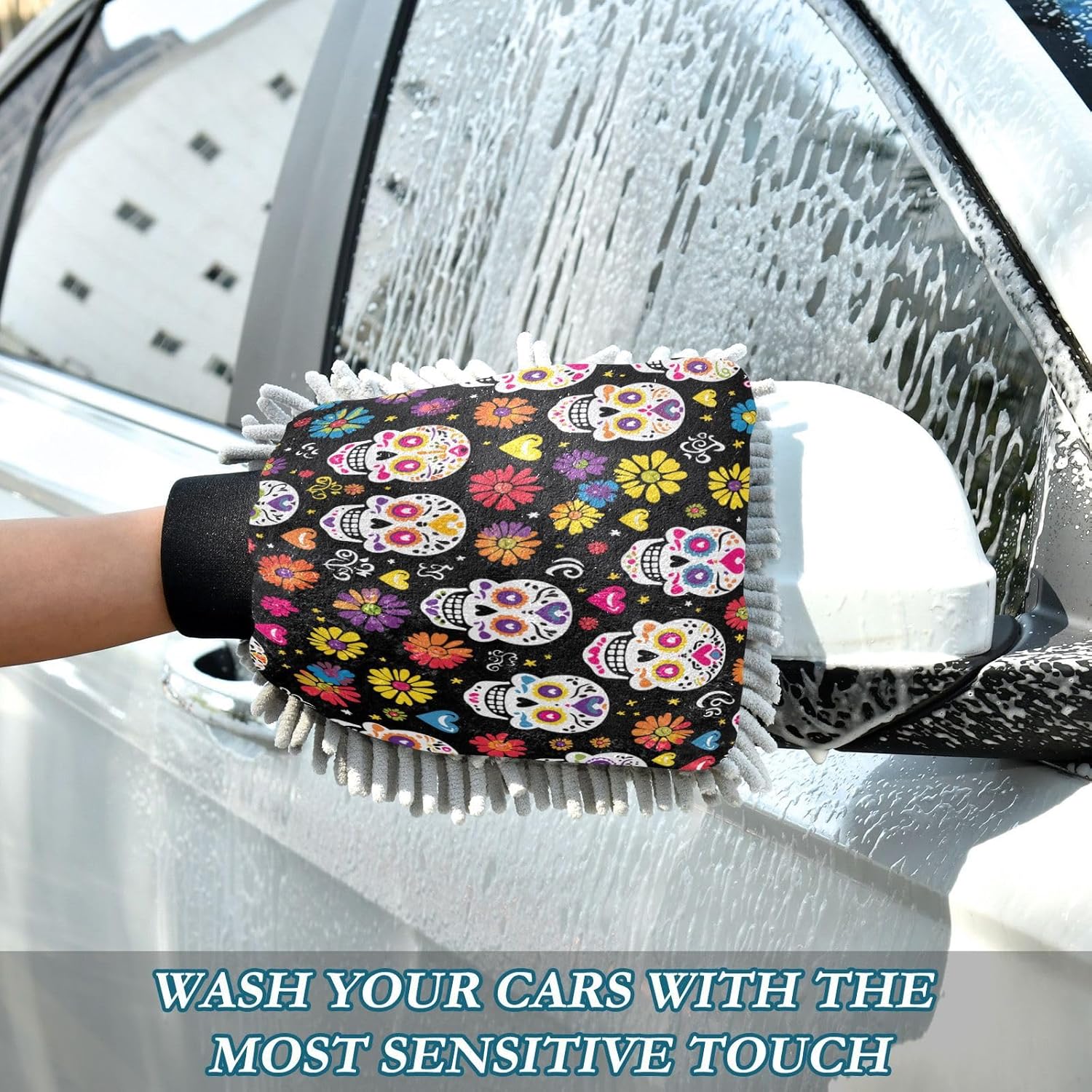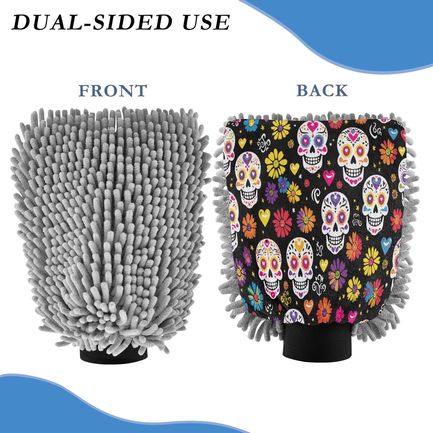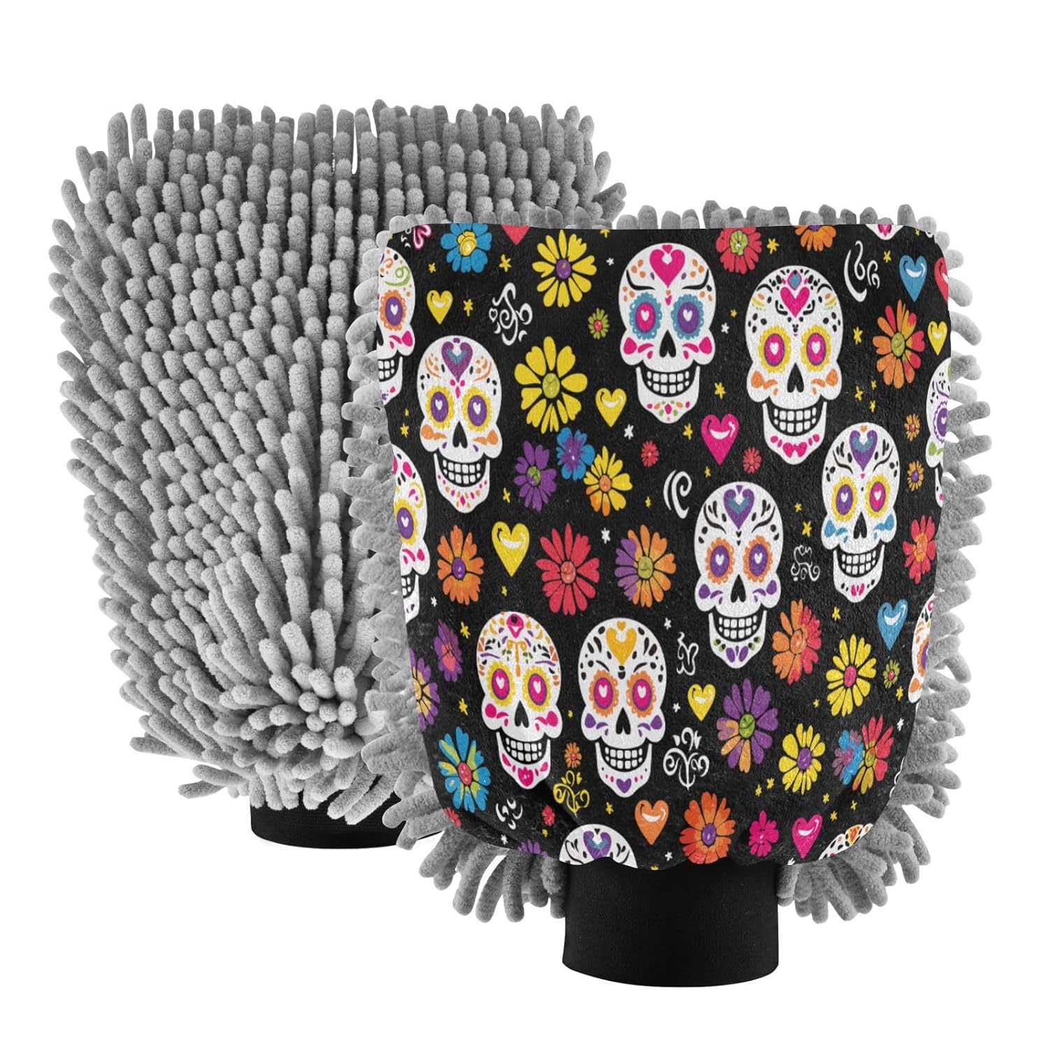 Luva de Lavagem de Carro 2 em 1 - Sugar Skull com Flores - Mits de Microfibra Chenille para Lavagem Sem Riscos