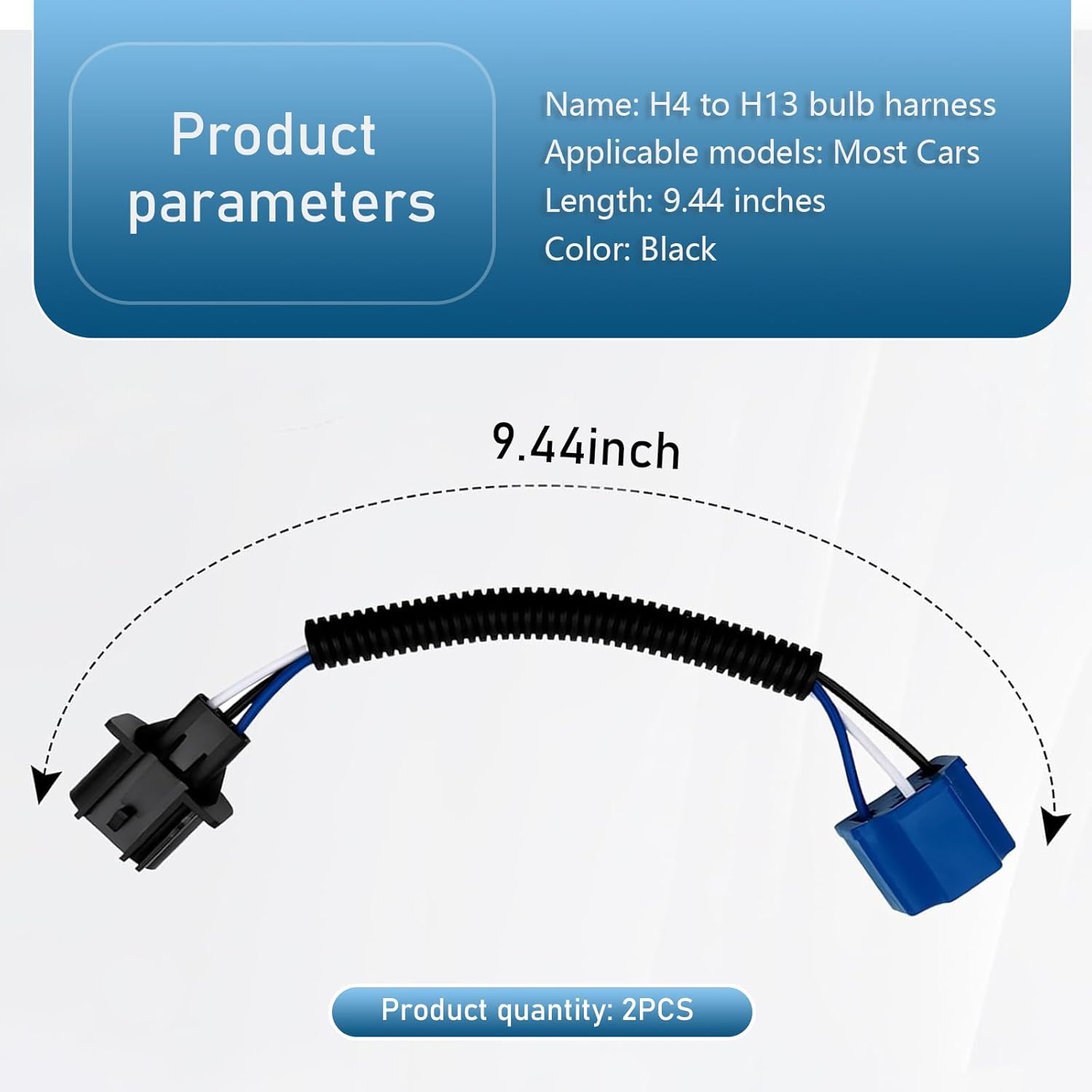 This is a straight forward H4 to H13 adapter I used on my wife’s car. It is very good quality with plastic shielding over the wires. Both worked right out of the bag with no issues. God Bless, Richard W.