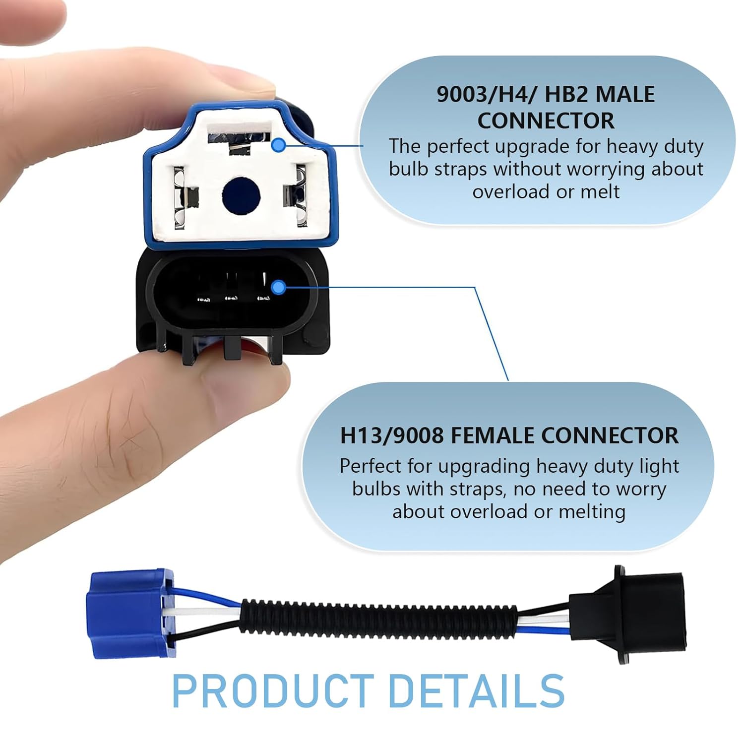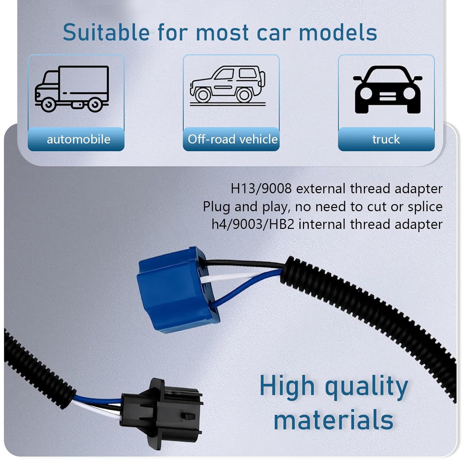 Além disso, a função de conversão deste adaptador permite a transformação direta de H13 macho para H4 fêmea, ideal para quem deseja atualizar tiras de lâmpadas pesadas sem se preocupar com sobrecargas ou modificações complexas.
