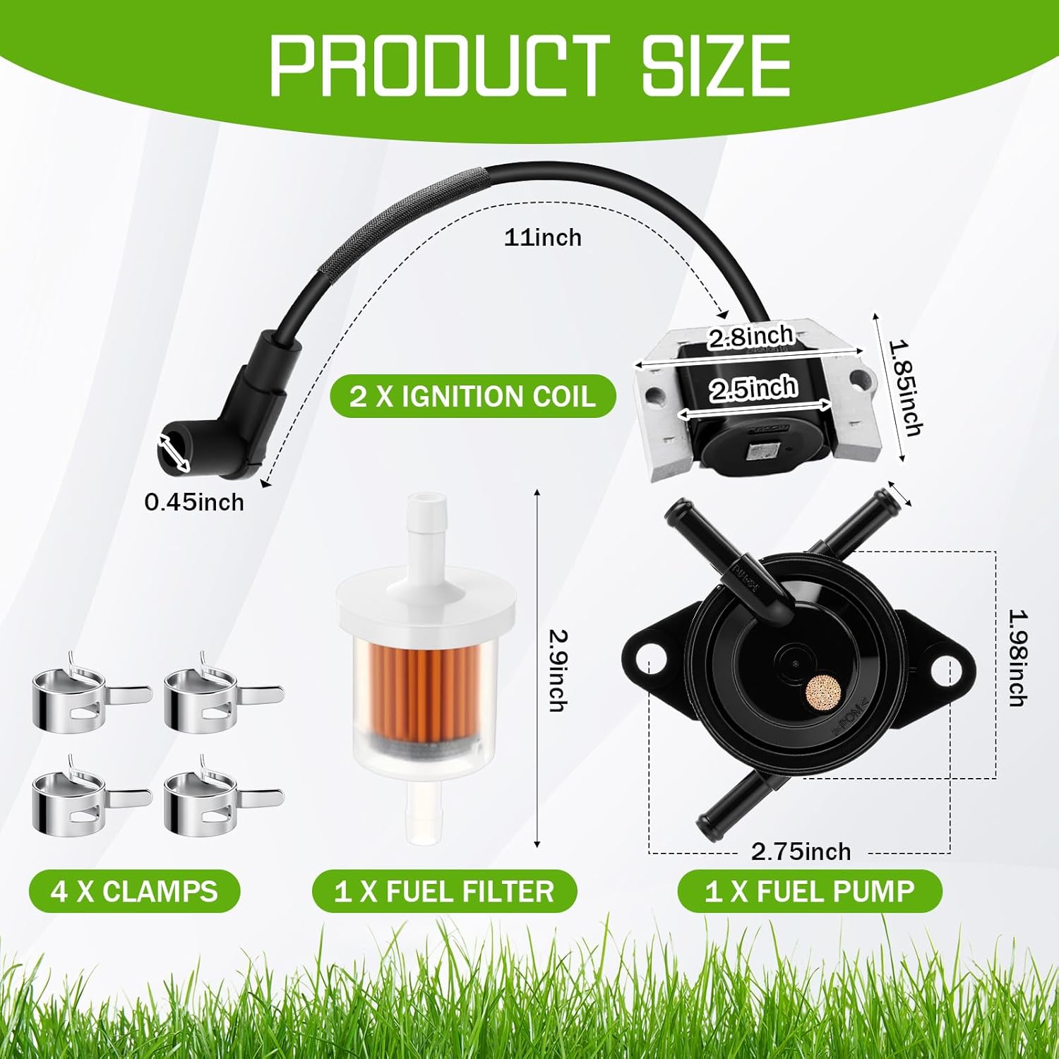 – Pacote Completo: Inclui 2 bobinas de ignição, 1 bomba de combustível, 1 filtro de combustível e 4 braçadeiras.