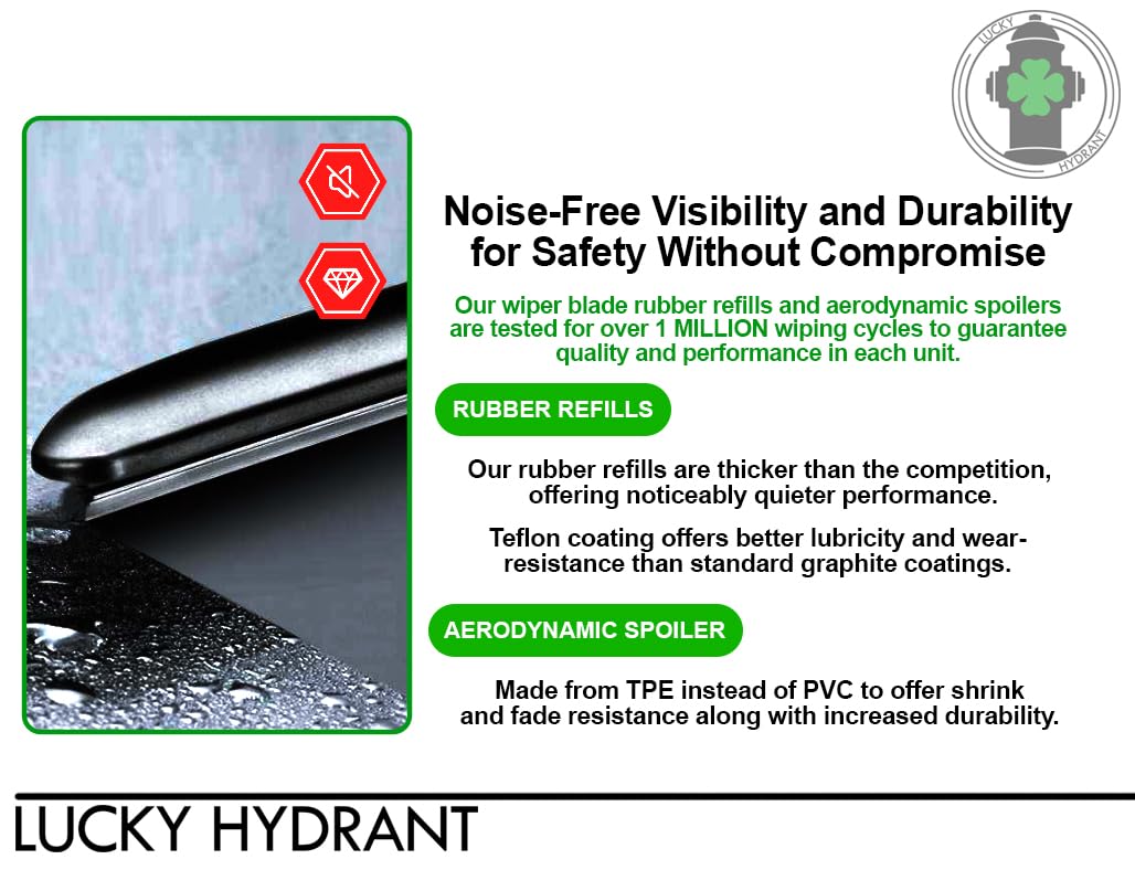 Os limpadores de para-brisa de 20″ são ideais para os lados do motorista e do passageiro, enquanto o limpador traseiro de 16″ assegura uma limpeza eficaz na parte traseira do veículo. Fabricados com borracha de alta qualidade, esses limpadores proporcionam uma limpeza suave e silenciosa, eliminando sujeira, água e detritos com eficiência. O design aerodinâmico reduz o arrasto, melhorando a eficiência durante a operação e garantindo que você tenha uma visão clara em qualquer situação.