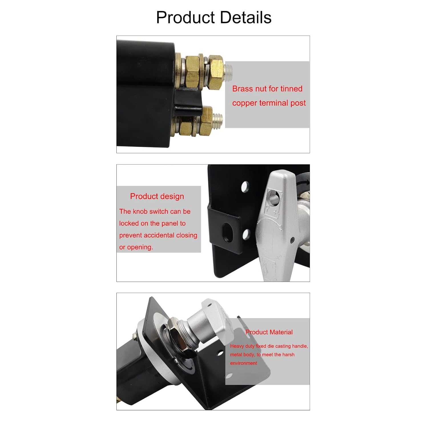 Fabricado com materiais de alta qualidade, como metal e cobre, o interruptor opera em uma faixa de tensão de 12V a 36V, com uma corrente nominal de 500A e uma corrente instantânea impressionante de 5000A. Equipado com dois terminais roscados de 10mm, ele é projetado para se conectar facilmente ao cabo negativo da bateria, proporcionando uma instalação simples e segura.