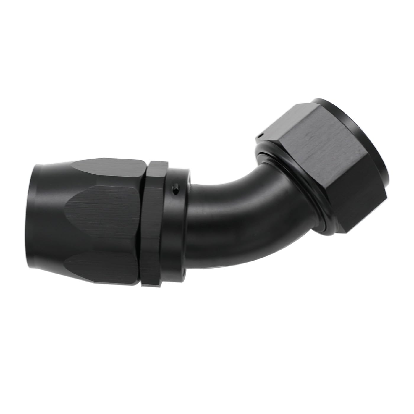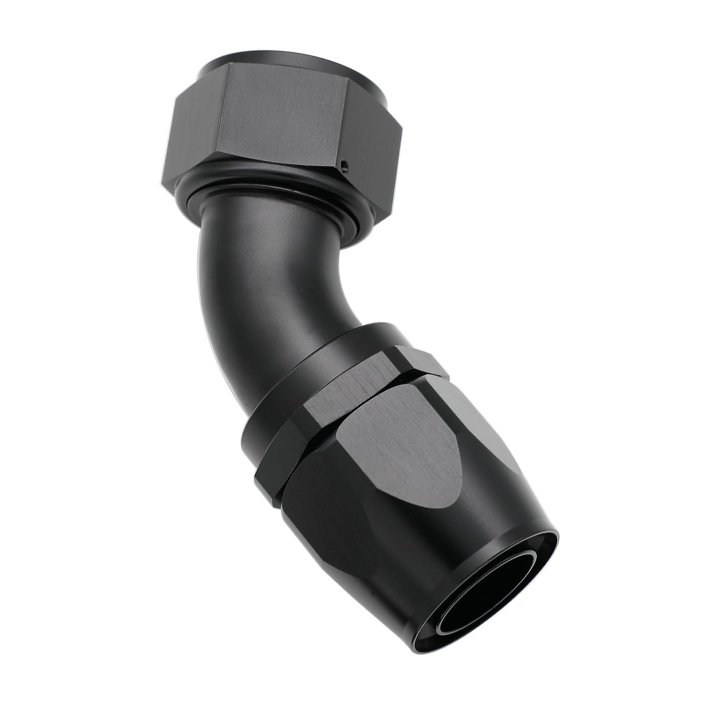 Adaptador de mangueira em ângulo de 45 graus AN20 em alumínio, ideal para linhas de combustível trançadas. Com acabamento preto, oferece durabilidade e resistência à corrosão. Seu design rotativo facilita a instalação e o ajuste, garantindo conexões seguras e eficientes. Compatível com sistemas de alta performance, é perfeito para quem busca qualidade e desempenho em projetos automotivos.