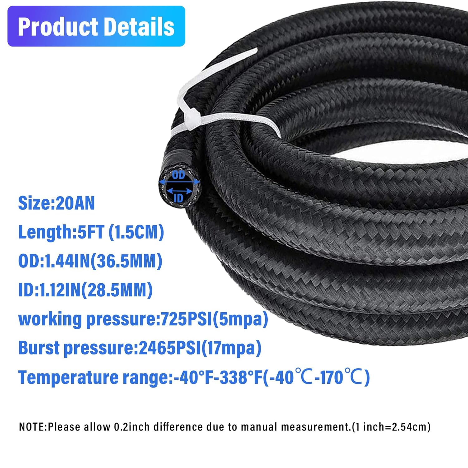 A Mangueira de Combustível 20AN de 5 pés (1,5 m) é a solução ideal para quem busca eficiência e durabilidade em sistemas de transporte de fluidos. Com um diâmetro interno de 1,12 polegadas (28,5 mm) e um diâmetro externo de 1,44 polegadas (36,5 mm), esta mangueira é projetada para atender às mais rigorosas exigências de desempenho. Antes de realizar a compra, é fundamental verificar se as dimensões são compatíveis com suas necessidades, pois a mangueira é compatível com adaptadores de junta de borracha, mas não com juntas de mangueira PTFE e não é adequada para E85.