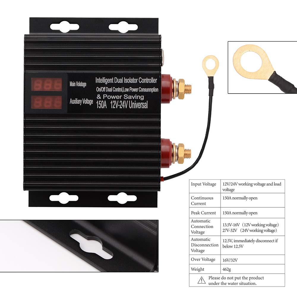 Compacto e portátil, o relé de isolamento de bateria é compatível com uma ampla variedade de veículos, incluindo Jeep, caminhões, SUVs, RVs e aplicações de camping. Com este isolador, você não precisa se preocupar em drenar a bateria original do seu veículo ao testar novos dispositivos durante suas aventuras off-road. O isolador de bateria dupla é uma excelente solução para prolongar a vida útil da bateria primária quando o motor do veículo está desligado.