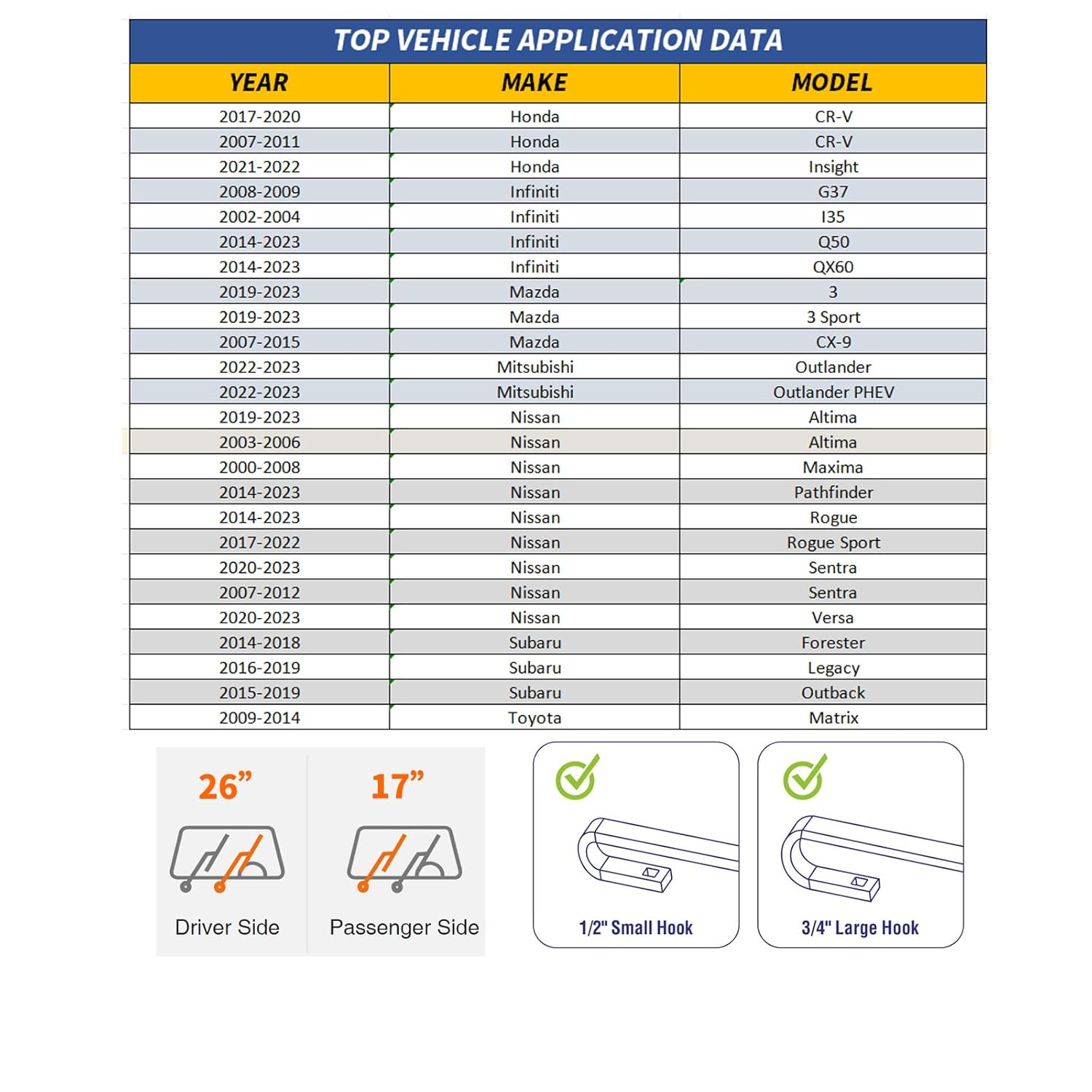 As lâminas de limpador de para-brisa de 26” e 17” são a escolha ideal para proprietários de veículos como Honda CR-V (2007-2011, 2017-2022), Honda HR-V (2023-2024), Nissan Altima (2002-2006, 2019-2023), Nissan Sentra (2007-2012), Nissan Pathfinder (2013-2023) e Nissan X-Trail (2014-2022). Com um design que garante um encaixe perfeito, essas lâminas são projetadas para oferecer desempenho superior em diversas condições climáticas.