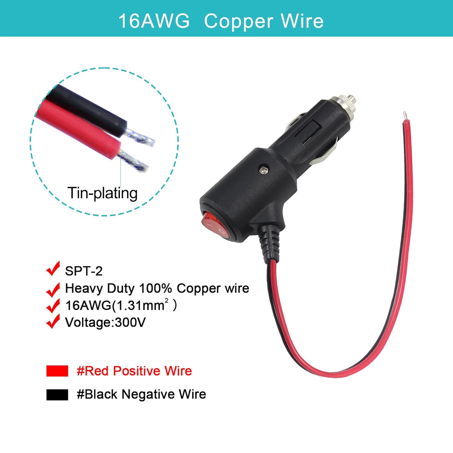 Good product, super nice to have a switch. I bought these for my LED baitfish submersible lights. I overkill everything, so I thought,why have only 1 light????? Yeah 3 sounds better!! These cigarette plugs are very well made. The wire is between 14-16ga, and the tips are dipped in soldier. The fit is tight, and with the switch, they’re awesome. Super convenient, so you don’t blind your night vision with green, or white light. I use these for other projects as well. Good product, well build for light duty 12v applications.