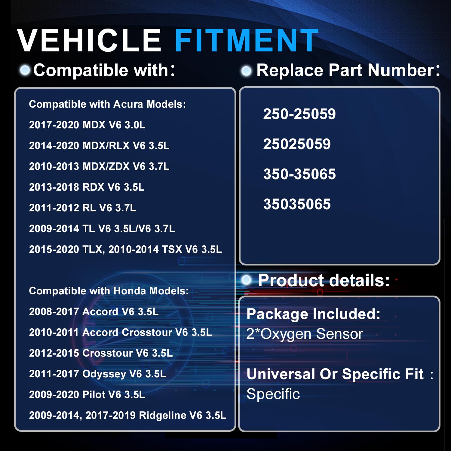 Antes de adquirir este sensor de oxigênio, é crucial verificar o ano e o modelo do seu veículo, assim como o número da peça intercambiável, para garantir a compatibilidade. Os números de referência incluem: 250-25059, 25025059, 350-35065 e 35035065. Este sensor é compatível com uma ampla gama de veículos Honda, incluindo o Honda Accord (2008-2017), Accord Crosstour (2010-2011), Odyssey (2011-2017), Pilot (2009-2020) e Ridgeline (2009-2014/2017-2019), todos equipados com motores de 3.5L. Além disso, é compatível com diversos modelos da Acura, como MDX (2017-2020), RDX (2013-2018) e TLX (2015-2020), entre outros.