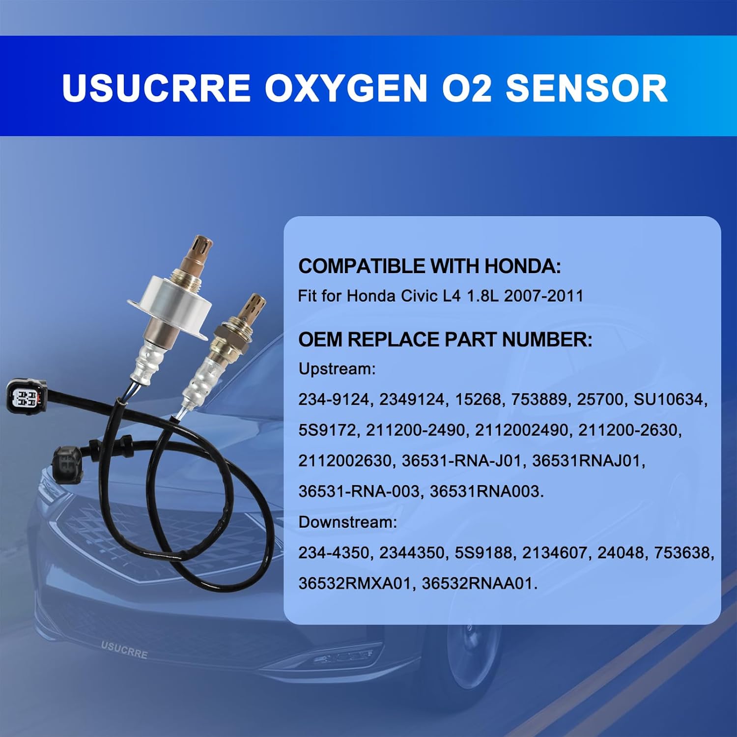 - Número da Peça de Substituição OEM: Os sensores de oxigênio Usucrre podem substituir as peças originais Upstream: 234-9124, 2349124, 15268, 753889, 25700, SU10634, 5S9172, 211200-2490, 2112002490, 211200-2630, 2112002630, 36531-RNA-J01, 36531RNAJ01, 36531-RNA-003, 36531RNA003. Downstream: 234-4350, 2344350, 5S9188, 2134607, 24048, 753638, 36532RMXA01, 36532RNAA01.
