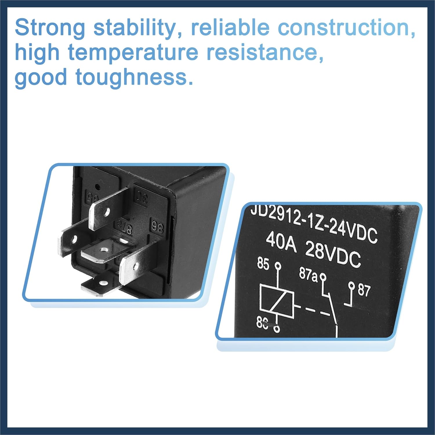 O relé automotivo JD2912-1Z-24VDC é a solução ideal para quem busca eficiência e confiabilidade em circuitos eletrônicos de veículos. Com um design elegante e robusto, este relé de 5 pinos é projetado para suportar uma corrente de até 40A, operando em uma tensão nominal de 24V. Sua construção em plástico de alta qualidade garante uma longa vida útil e estabilidade, tornando-o a escolha preferida para aplicações automotivas.