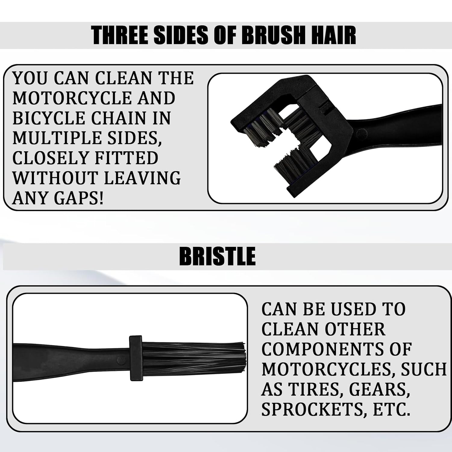 A limpeza de correntes de motocicletas e bicicletas nunca foi tão prática. O design exclusivo da escova permite que você limpe a corrente em múltiplos ângulos simultaneamente, enquanto as cerdas longas são ideais para limpar pneus, engrenagens e pinhões. Fabricado com material PVC de alta qualidade e cerdas de nylon, o kit é confortável de segurar e resistente à deformação, garantindo uma longa vida útil. Com dimensões de 9.65 x 1.96 x 1.26 polegadas, o kit é amplamente aplicável, podendo ser utilizado em motocicletas, triciclos, bicicletas, veículos híbridos e off-road.