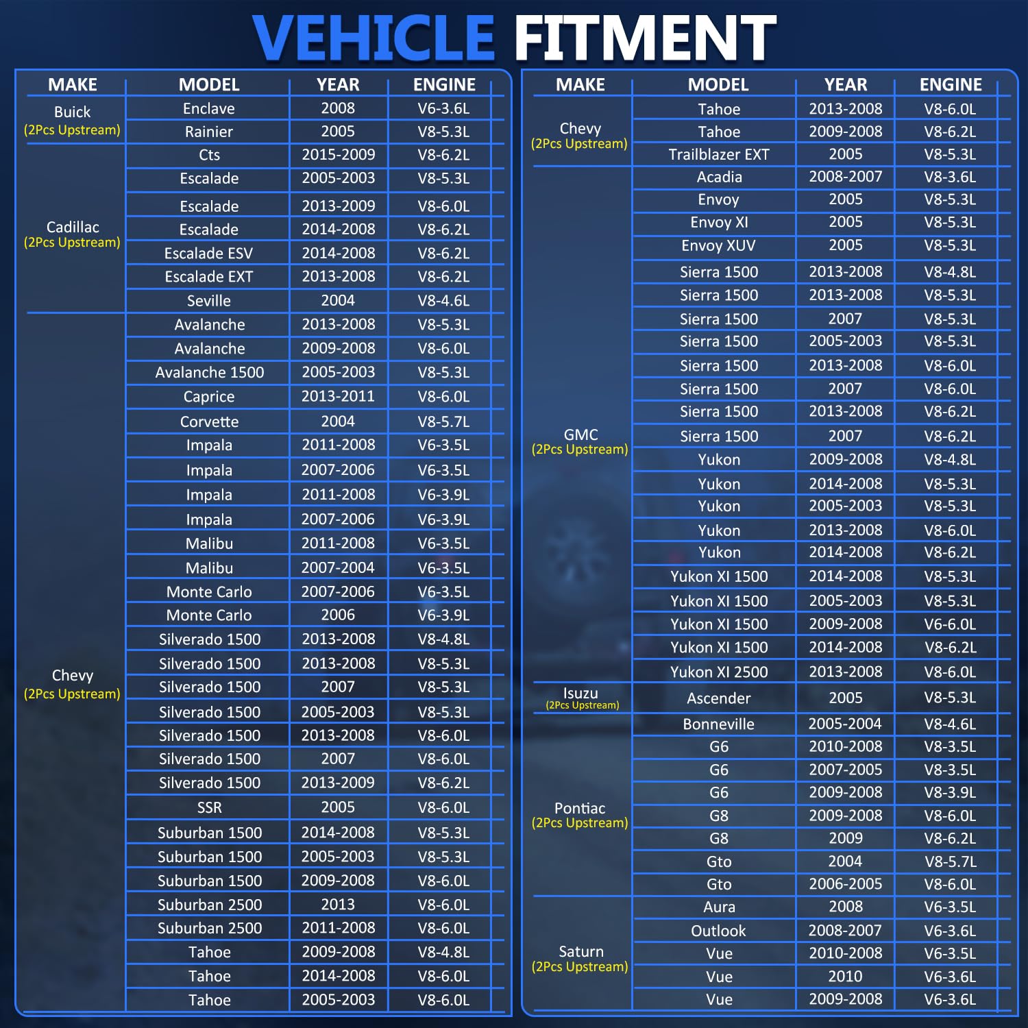 The product description says it would fit 2003 Silverado both upstream and downstream . It doesn’t and I have no plans to reorder. Very disappointed