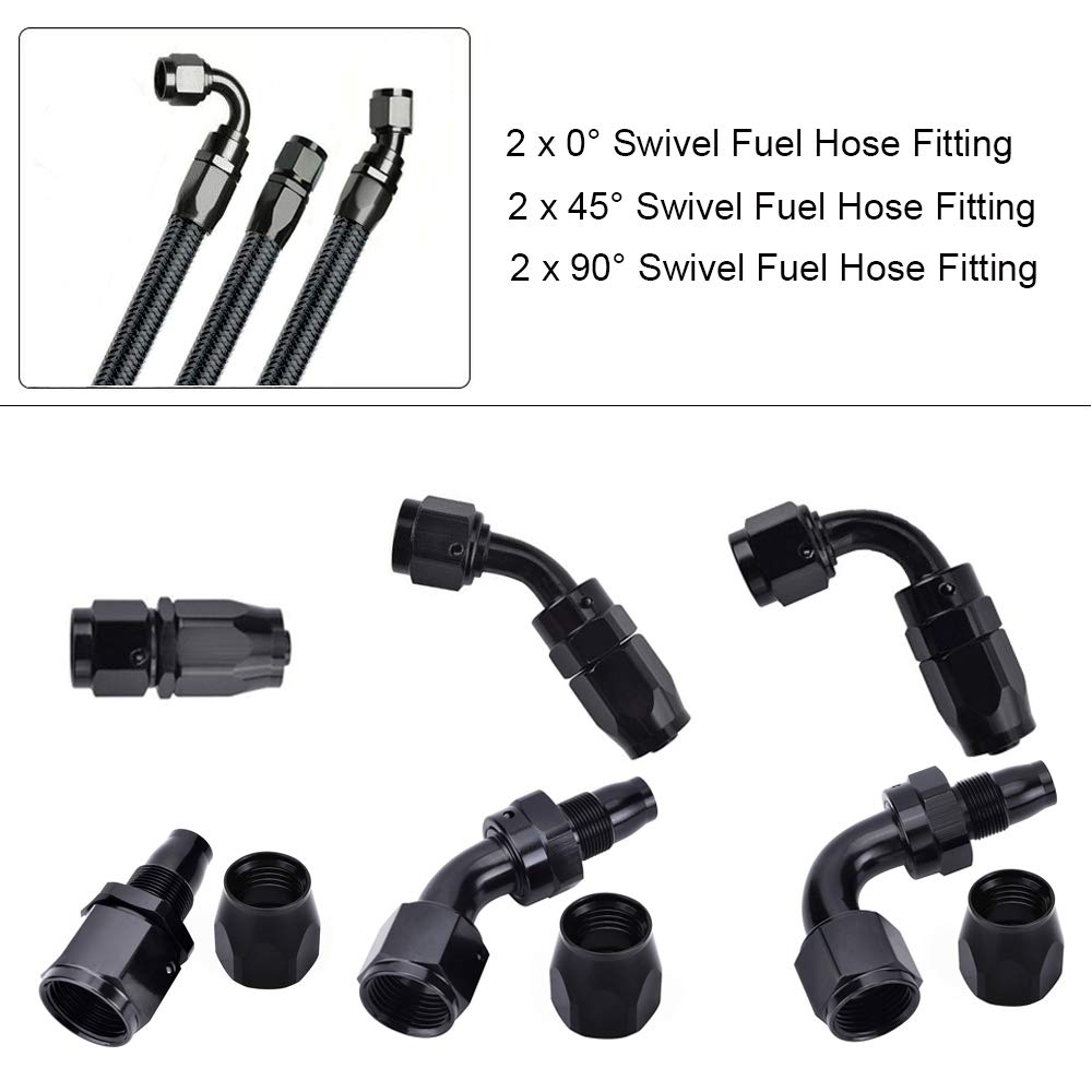 – Componentes Inclusos: 1 mangueira de 6AN 12FT, 2 terminais retos, 2 terminais de 45 graus e 2 terminais de 90 graus.