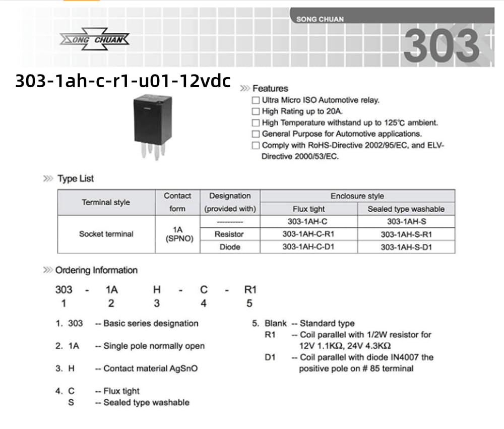 O Relay 303-1AH-C-R1-U01-12VDC é uma solução robusta e confiável para aplicações automotivas, especialmente projetado para o controle de ventiladores de refrigeração. Com um design ultra micro ISO, este relé é ideal para quem busca eficiência e durabilidade em sistemas elétricos automotivos. Com uma classificação de até 20A, ele opera em uma tensão de 12 VDC, garantindo um desempenho excepcional em condições desafiadoras.