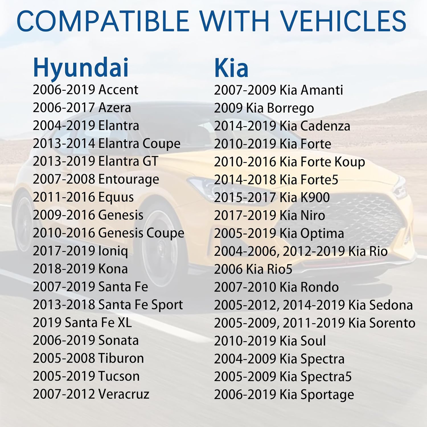 – Hyundai: Accent (2006-2019), Azera (2006-2017), Elantra (2006-2019), Genesis (2010-2016), Santa Fe (2006-2019), Sonata (2006-2019), Tucson (2006-2019).