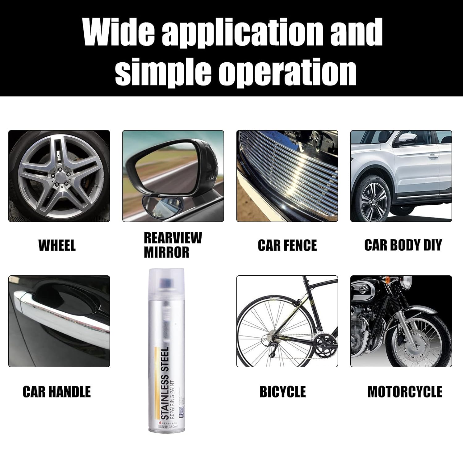 – Wide Application: A tinta spray metálica é amplamente utilizada em automóveis, motocicletas, bicicletas, decoração de interiores e em diversas outras áreas. É aplicável a várias partes de veículos e produtos de aço inoxidável, melhorando a aparência de metais enferrujados.
