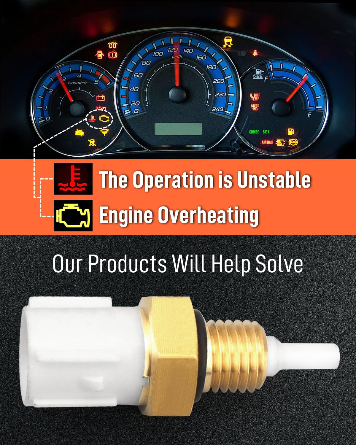 – Este sensor é projetado para resolver problemas como superaquecimento do motor, operação instável do motor, falhas e medidor de temperatura do motor com mau funcionamento, frequentemente indicados no painel do seu veículo.